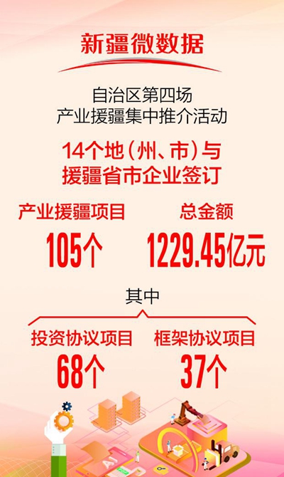 12月10日,自治区第四场产业援疆集中推介活动在和田市举行,自治区相关单位、19个援疆省市前后方单位及14个地(州、市)和疆内外400余家企业代表参加。签约仪式上,14个地(州、市)与援疆省市企业签订产业援疆项目105个,签约金额1229.45亿元。