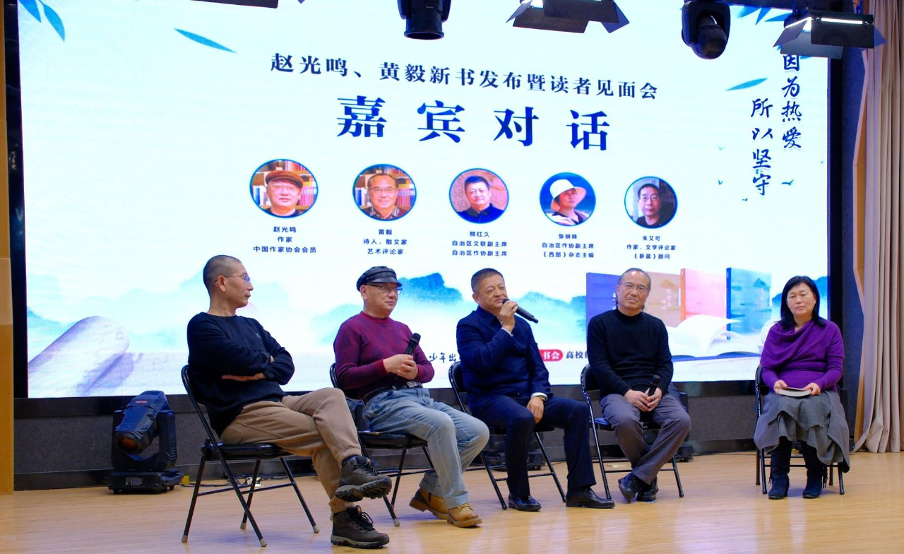 连日的漫天飞雪没有止住人们涌向新疆财经大学音乐厅的脚步。12月11日下午,“《新晨》读书会高校行”以“因为热爱,所以坚守”为主题,带领广大师生和文学爱好者走进作家赵光鸣、黄毅的文学世界。