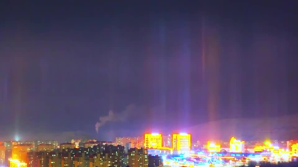 近日,新疆阿勒泰市出现罕见的“寒夜光柱”景象,这些光柱笔直地挺立在夜空中,如梦似幻。“寒夜光柱”多发生在寒冷冬夜,是水汽以冰晶形态悬浮在空气中,反射周围灯光而形成的光柱虚影。