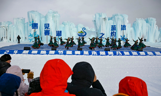 12月21日,演员在赛里木湖滑雪场开板仪式上表演(无人机照片)。新华社发(赛永杰 摄)
