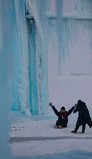 12月21日,游客在活动现场赛里木湖蓝冰前打卡。新华社记者 陈朔 摄