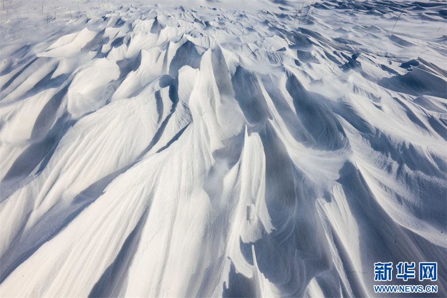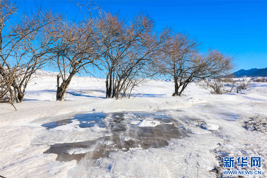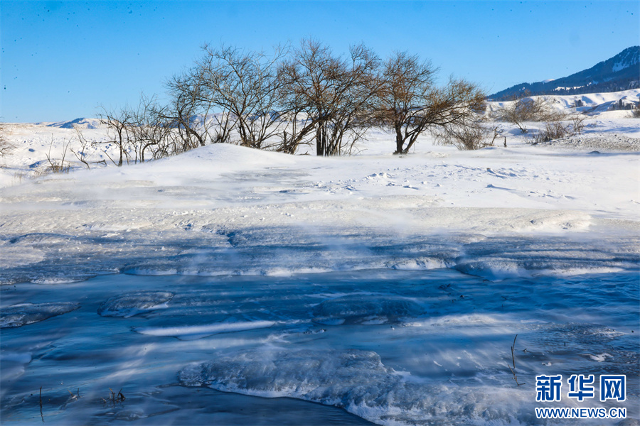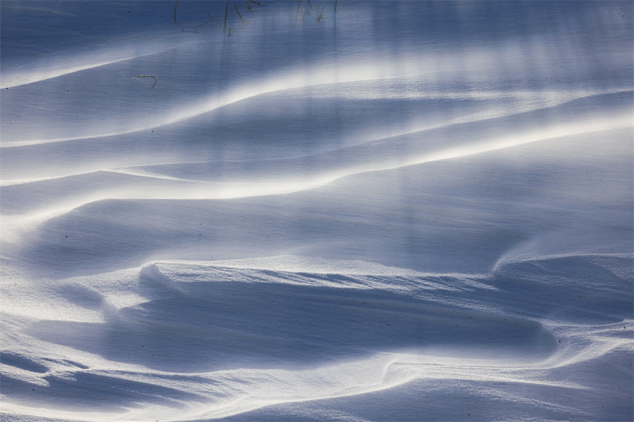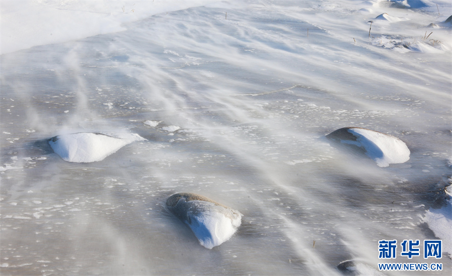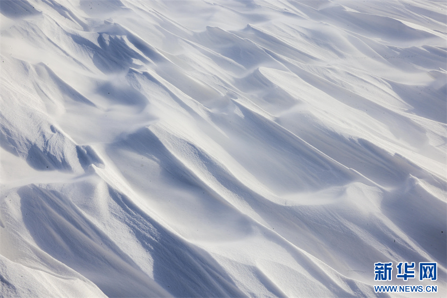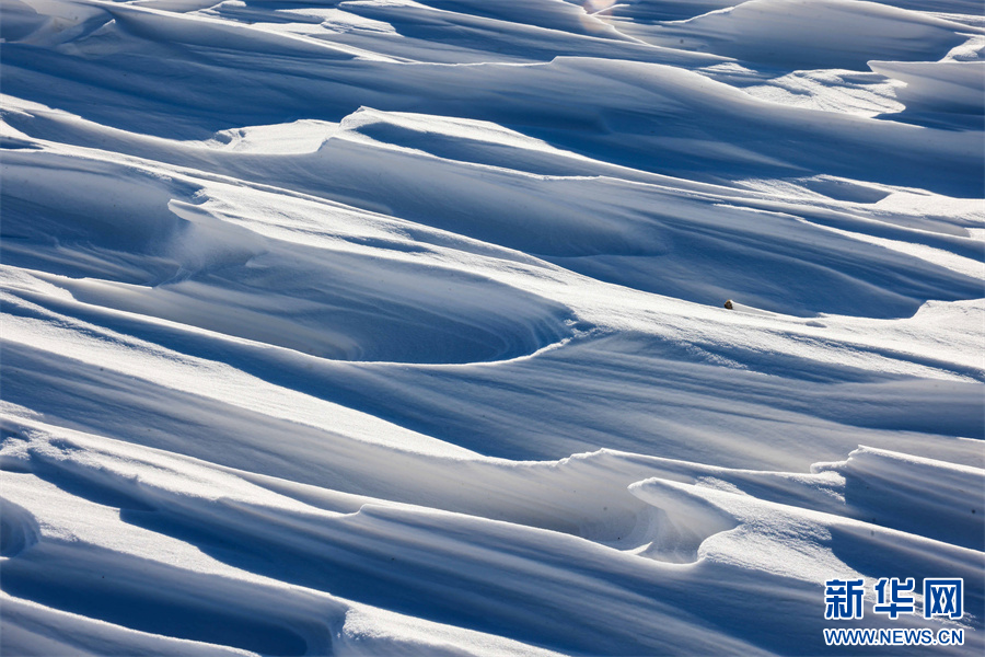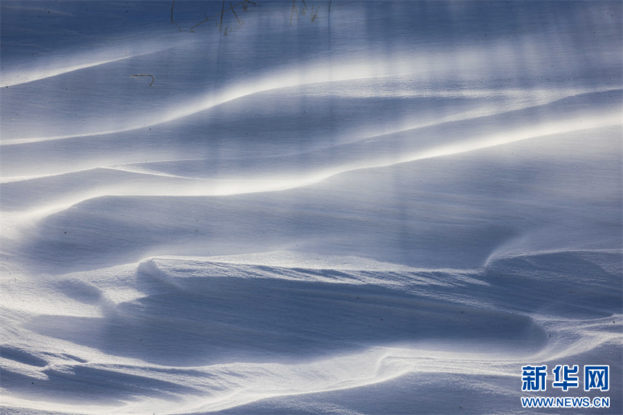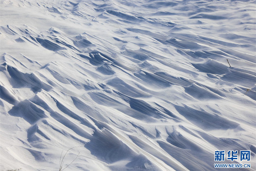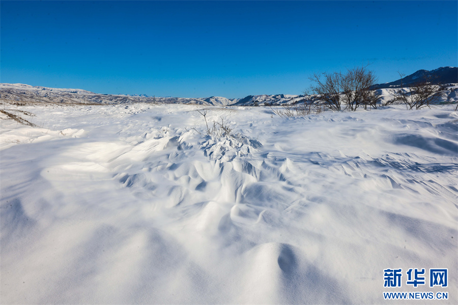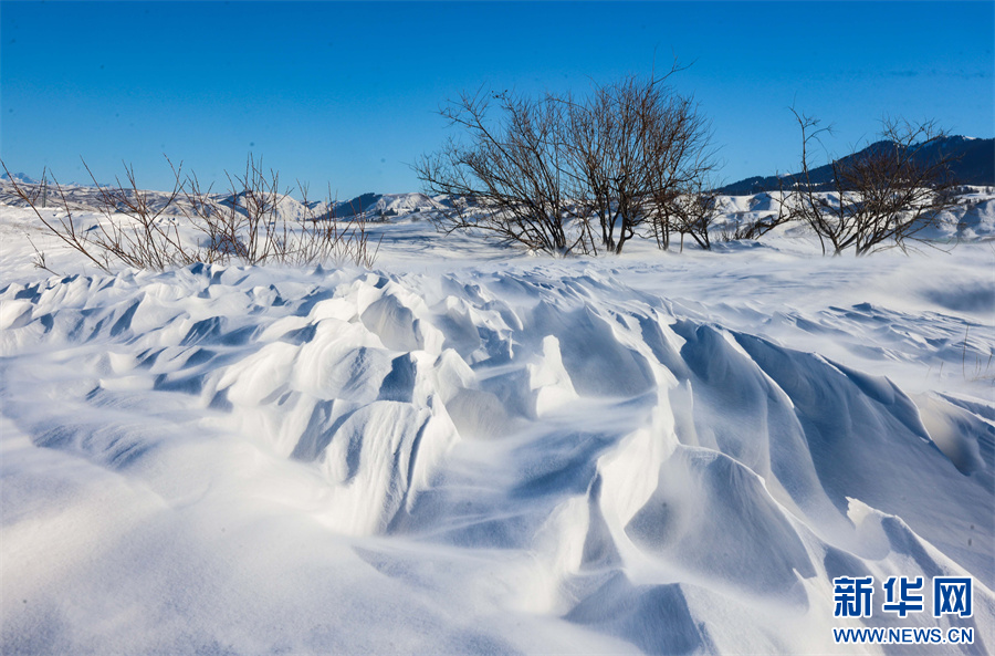 冬日的那拉提大草原被白雪覆盖,银装素裹,沉静悠远。在那拉提景区河谷草原,通常天气晴朗之时,就会刮起东风,此时会伴随有强风与雪花交织的奇幻景象——风吹雪。大草原上,大风裹挟积雪快速流动,形成了如流水经过沙滩般的景象。大风将雪地吹出各式花样,有的如水波,一层层延伸到远方;有的如山丘,连绵起伏;颗粒状的白雪在茫茫大草原上飞舞,犹如瀑布一般。