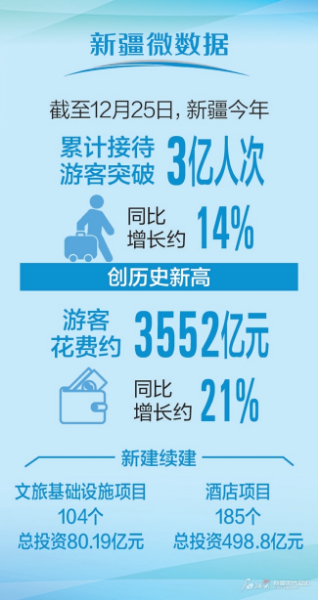 截至12月25日,新疆今年累计接待游客突破3亿人次,同比增长约14%,创历史新高;游客花费约3552亿元,同比增长约21%。