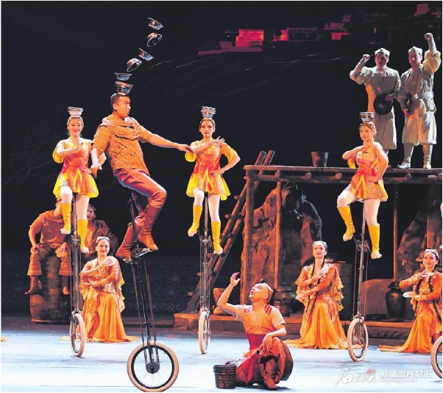 全剧用10个篇章,展现包括高空钢丝、滚灯、蹬鼓、高车踢碗、山地车、吊环、空竹、蹦床、抖杠、摇绳、手技、魔术、生命之轮、转盘、绸吊等30多个杂技节目元素。剧中综合运用杂技、魔术、新疆民族歌舞、音乐剧等丰富艺术形式,巧妙融入木卡姆、达瓦孜等特色元素,精彩呈现惊险、刺激、新奇、唯美、诙谐等多元风格。演出中,老演员带着新演员,共同完成了这场令人惊艳的舞台呈现。不仅展现了杂技的惊险与刺激,更通过优美的舞蹈和动人的音乐,传达了情感与主题,体现了新疆艺术剧院杂技团在新人培养方面的成效。