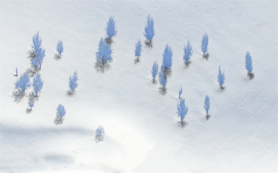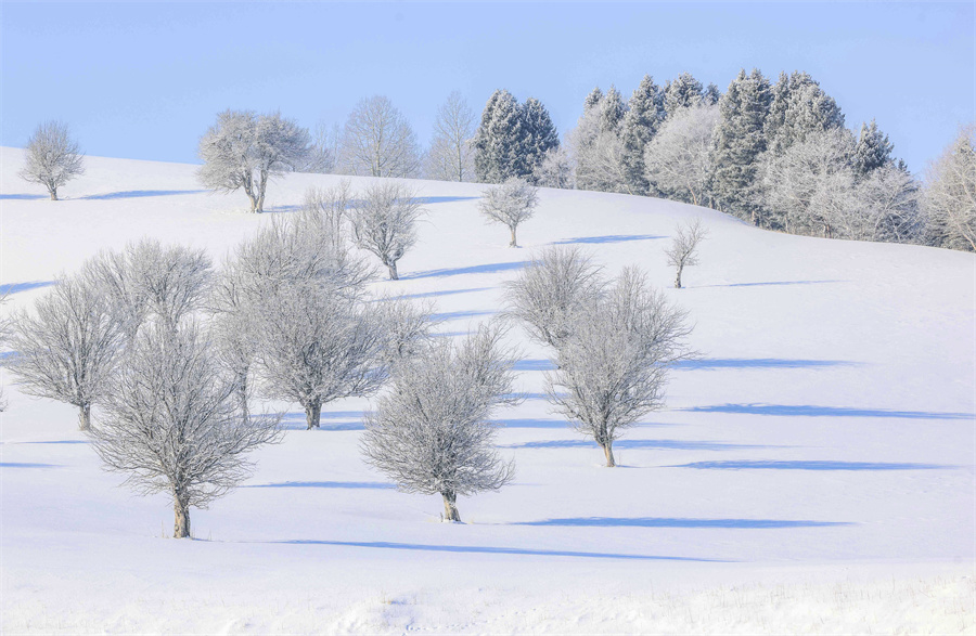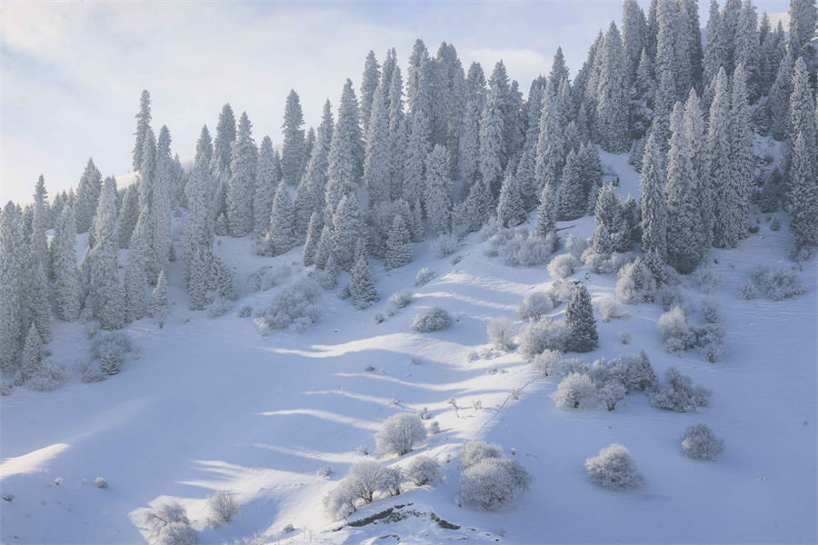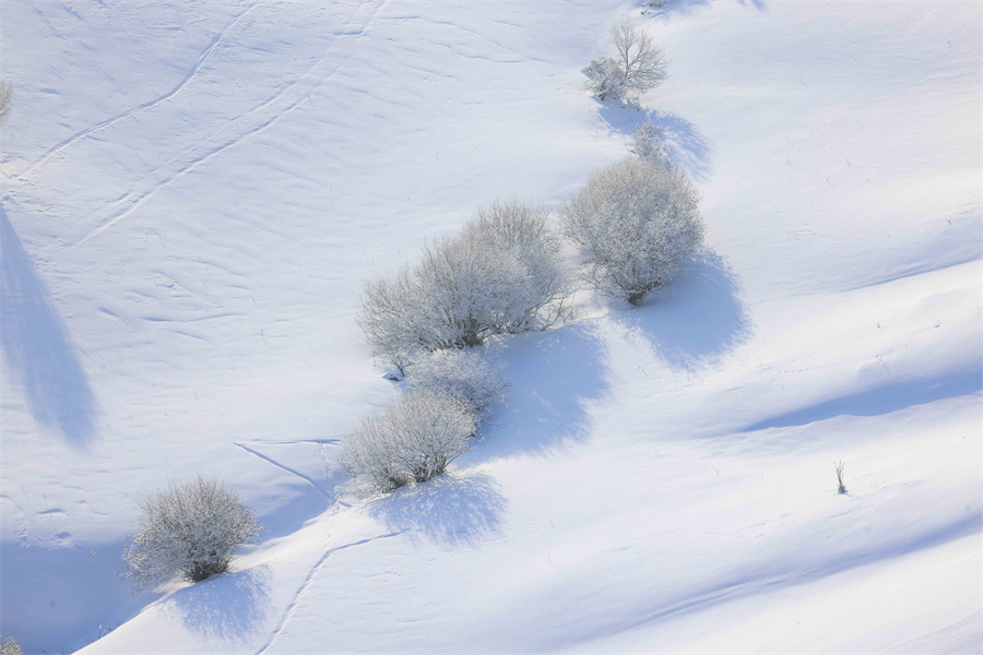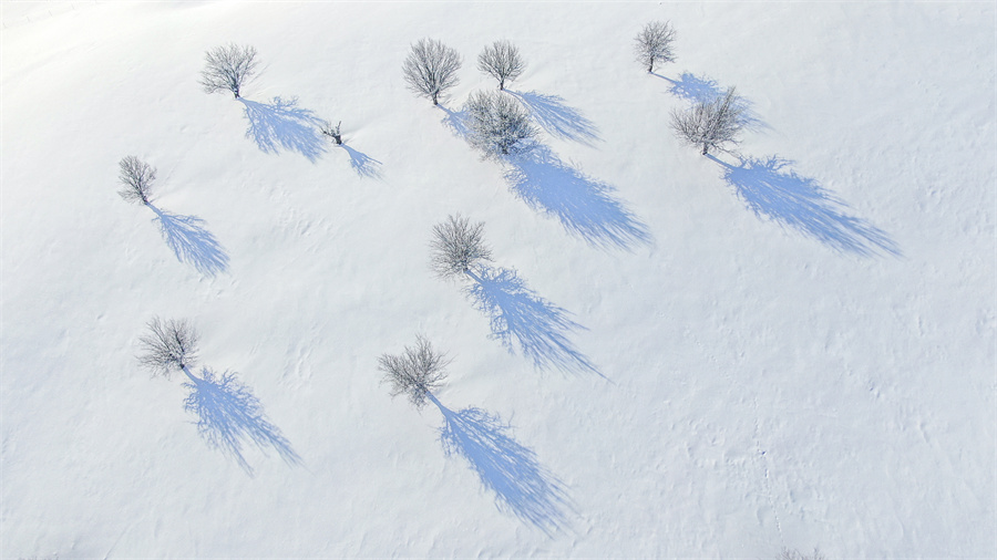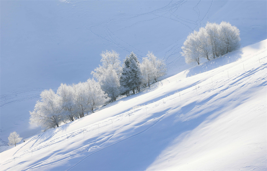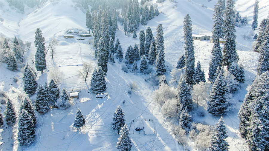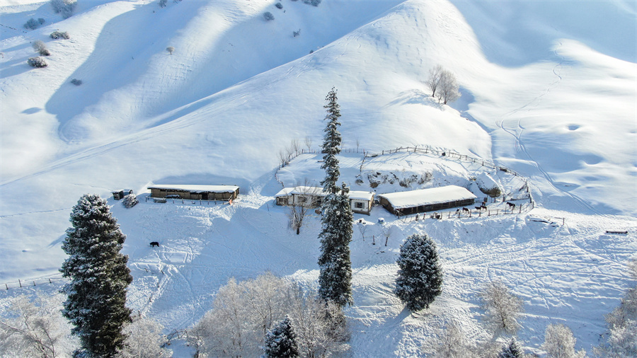 一场雪后,那拉提草原,宛如被大自然精心雕琢的冰雪仙境,一片银装素裹,静谧而圣洁。棵棵树木好似披上了纯净洁白的盛装,树挂晶莹剔透,像大自然馈赠的白色锦袍,如霜花绽放,每一寸都彰显着冬日的浪漫与诗意。洁白无垠的雪地上,树木的影子清晰倒映着,影影绰绰,犹如一幅幅水墨画卷。在这如梦似幻的冰雪世界里,牧民的冬窝子恰到好处地点缀其中,为这片静谧的白色天地,增添了几分人间烟火的温馨与灵动。