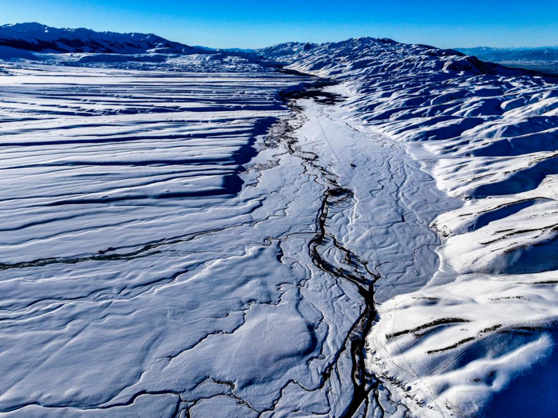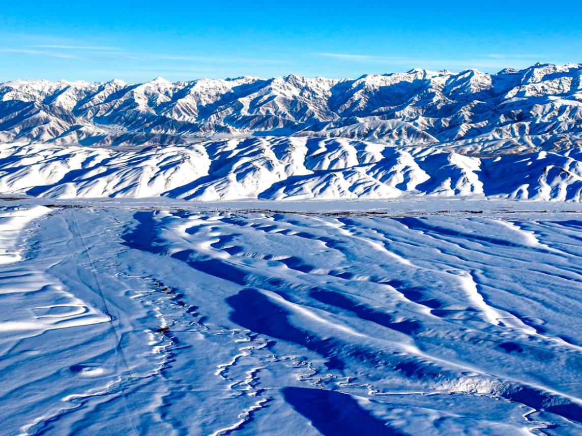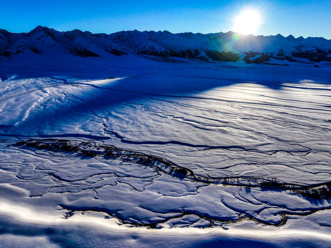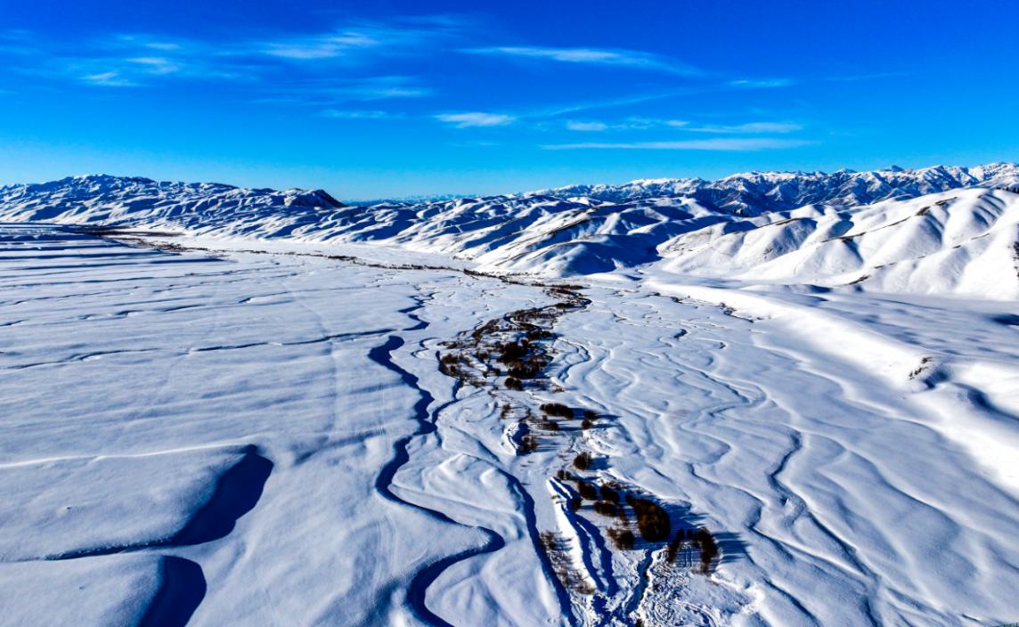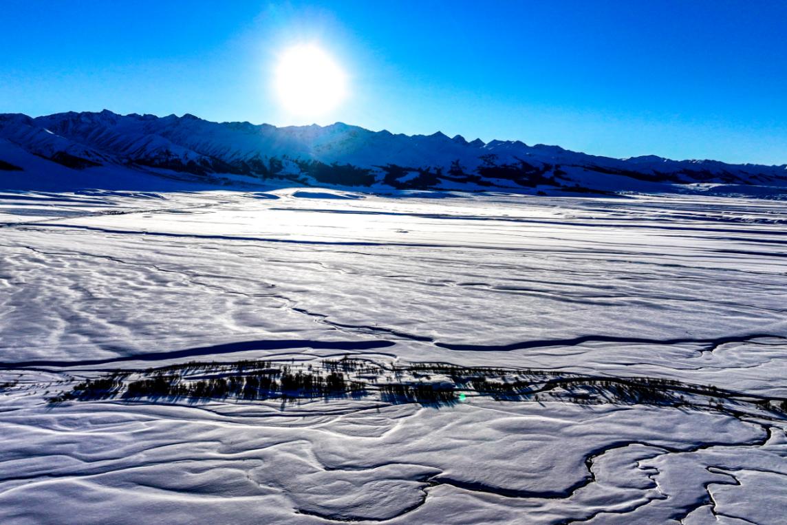 冬日,那拉提空中草原摇身一变,幻化成冰雪秘境。白色的河流蜿蜒前行,恰似洁白无瑕的绸带,在广袤无垠的大地上交织,向远方雪山无限延伸。