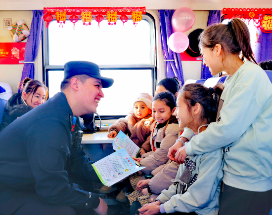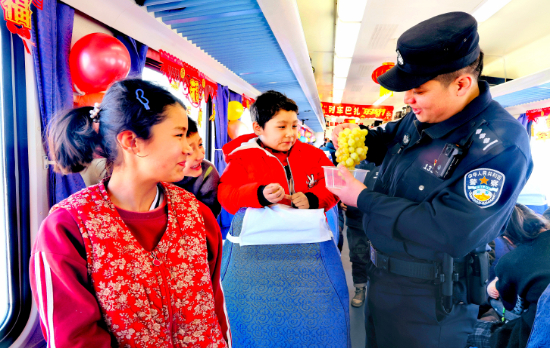 1月17日,在“和田玉龙号”公益小慢车上,乌鲁木齐铁路公安局库尔勒公安处乘警支队民警正在向乘车旅客开展防盗反诈知识宣传。武陇慧 摄