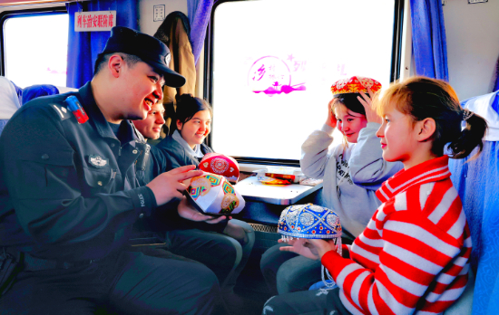 1月17日,乌鲁木齐铁路公安局库尔勒公安处乘警支队民警,在“和田玉龙号”列车巴扎年货节活动中,向广大旅客和在列车上售卖农副产品及手工艺品的沿线农户开展防盗反诈知识宣传。武陇慧 摄