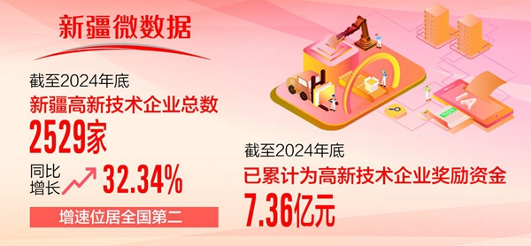 截至2024年底,新疆高新技术企业总数2529家,同比增长32.34%,增速位居全国第二。