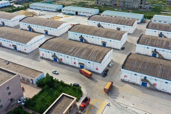 运粮车进入昌粮集团奇台粮油有限责任公司中心仓库(2024年7月9日摄,无人机照片)。新华社记者 丁磊 摄