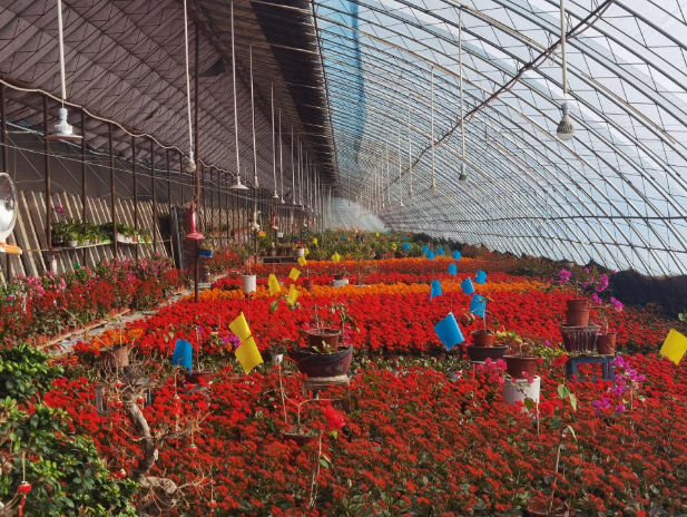 139栋温室大棚里有3栋种植花卉,棚内没有用化学方式喷药除虫,而是用物理办法在空中悬挂诱虫板纸贴。