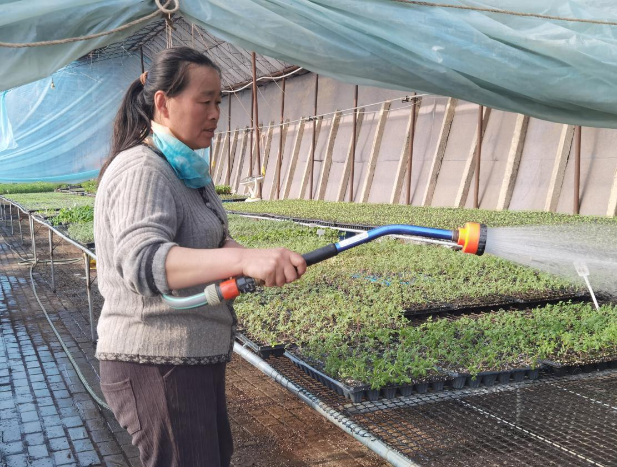 新疆绿丰农业产业科技开发有限公司高级农技师李洪华正在为茄果浇水。李恬蕊 摄