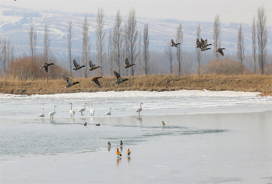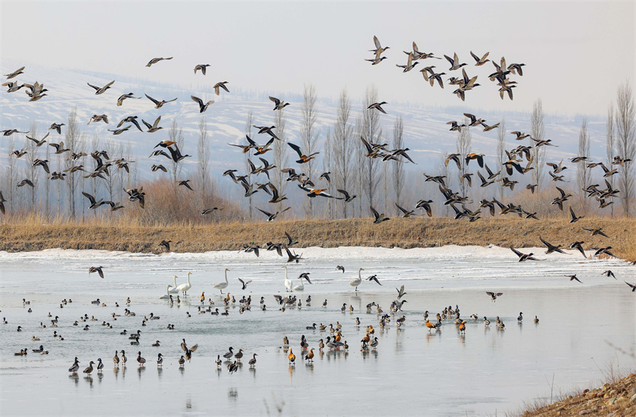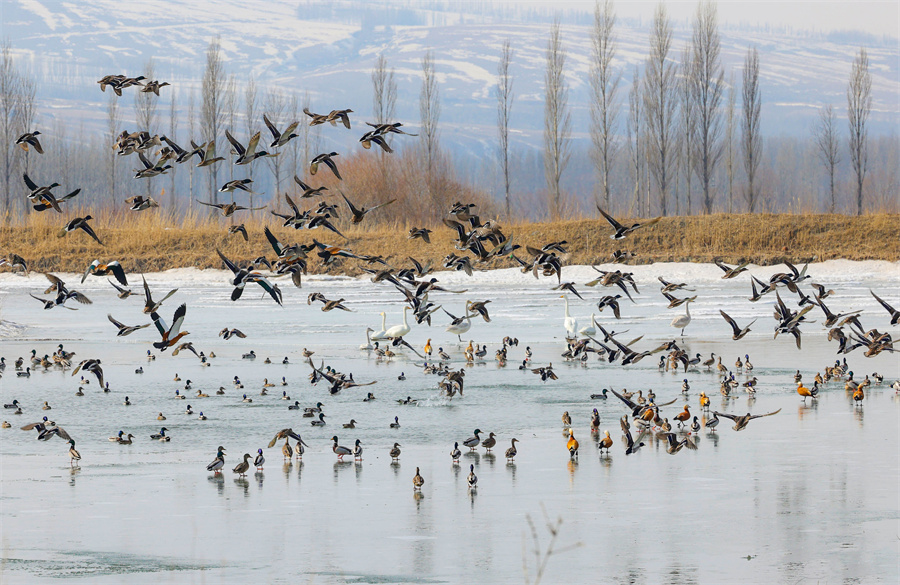 近日,随着气温逐渐回升,位于新疆新源县坎苏镇的“鱼儿山风景区”人工小湖呈现出一幅独特的景象:湖面处于半冰半水状态,一群群野鸭、天鹅、赤麻鸭等在此栖息,为这里增添勃勃生机。它们成群结队地在同一湖面上,或悠然漂浮,或埋头觅食,自在又惬意。这时,若有人不经意靠近,瞬间打破这份宁静,呼呼啦啦,瞬间成群飞起。一时间,湖面上空满是它们矫健的身姿,翅膀扇动的呼呼声,交织成一曲激昂的乐章,场面蔚为壮观。