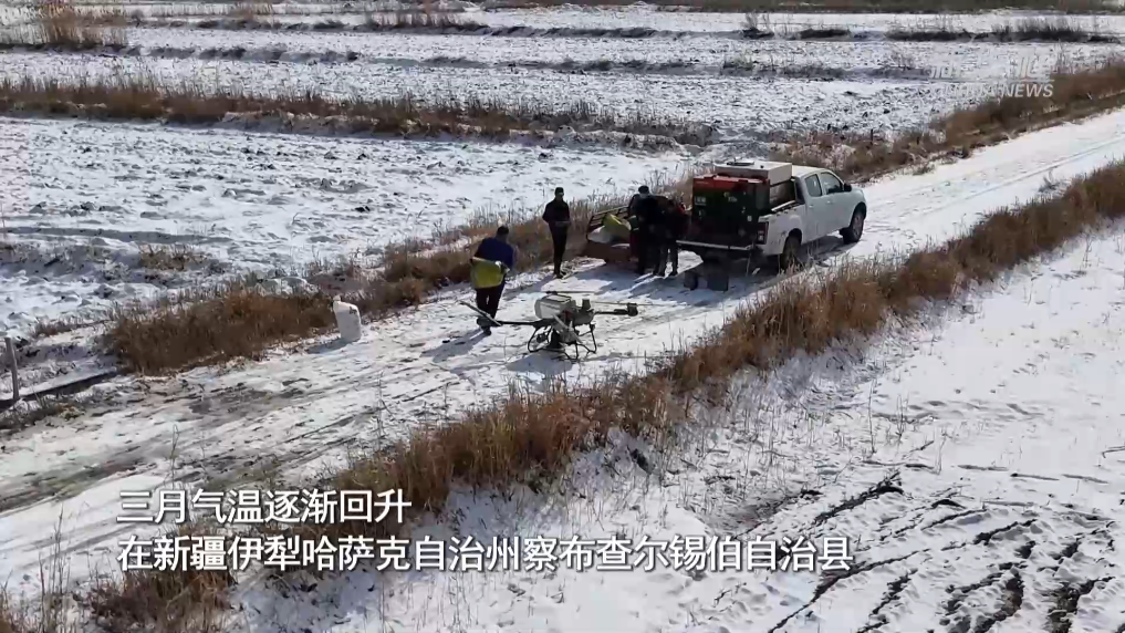 三月气温逐渐回升,在新疆伊犁哈萨克自治州察布查尔锡伯自治县,农户紧盯融雪情况,抓紧时机实施破雪施肥作业,加速冬小麦苗情转化,确保粮食安全。