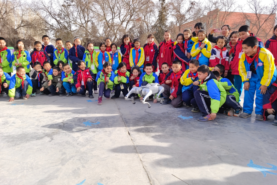 “快过来呀,我们快去和它握握手!”“哇,快看!这架无人机接收到队长的指令,机翼开始转动啦!” 活动现场,AI 智能科技创新产品的展示区瞬间成了人气爆棚的焦点,学生们的热情如同燃烧的小宇宙,瞬间被点燃。瞧,那只灵活俏皮的机器狗,在场地中央大秀 “才艺”,一会儿悠闲地散步,一会儿来个帅气的跑步冲刺,接着又轻盈地跳跃、前扑,甚至还能来几个高难度的空翻、打滚,最后还不忘乖巧地拱手送上祝福,随着欢快的音乐节奏欢快起舞,萌态十足。一旁,6 架鲜艳的红色无人机也不甘示弱,依次接收指令,整齐划一地起飞、在空中盘旋,变换着各种酷炫的编队,仿佛在进行一场精彩绝伦的空中舞蹈表演。这充满科技感的精彩展示,让现场赞叹声此起彼伏,“好可爱呀!”“太厉害啦!” 学生们的眼睛里闪烁着好奇与兴奋的光芒,一个个迫不及待地伸出小手,争着和机器狗握手,小心翼翼地触摸无人机。当展示结束时,他们还恋恋不舍地和机器狗挥手道别,眼神里满是留恋。
