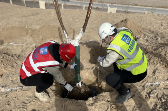 植树现场,大家热情高涨、分工协作、干劲十足。项目“铁三角”发挥带头作用,积极协调工作,项目管理人员紧密配合,将一棵棵树苗植入新坑,回锹铲土,扶正苗木,培土踩实,围堰浇水,新植的树苗在春风中摇曳生姿,为阿图什市增添了一片生机勃勃的绿色。