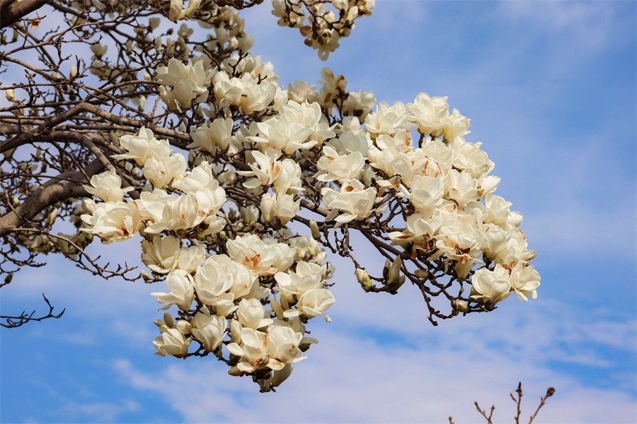 玉兰花盛开,花瓣层层叠叠,甚是壮观。