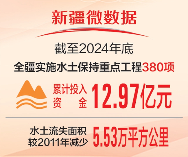 截至2024年底,全疆实施水土保持重点工程380项,累计投入资金12.97亿元。依法依规审批生产建设项目水土保持方案2.88万项,完成2.87万个疑似违法违规图斑的解译、核查、认定、查处和整改工作。连续7年开展水土流失动态监测,加快推进水土流失综合防治和美丽新疆建设。