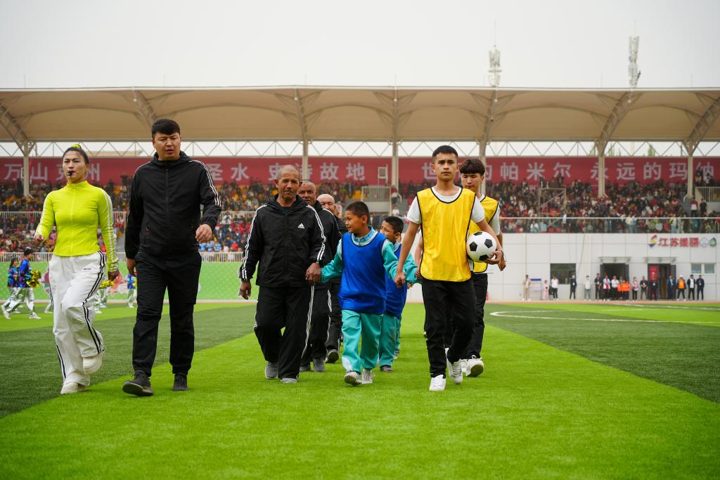 这是在2025新疆克孜勒苏柯尔克孜自治州足球联赛开幕式上,当地老年、青年和儿童群体代表表演节目《三代人足球传承》(4月12日摄)。
