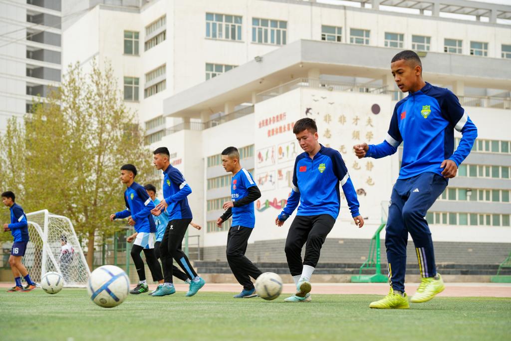 这是在新疆克孜勒苏柯尔克孜自治州阿图什一中,校园足球队的队员们在进行训练(4月12日摄)。