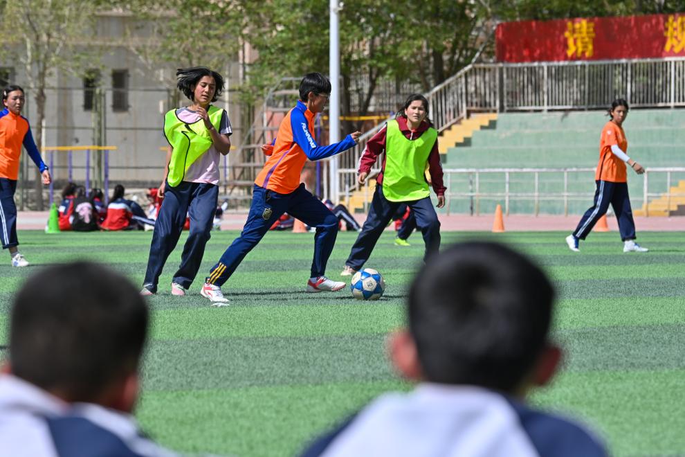这是在新疆克孜勒苏柯尔克孜自治州阿图什市硝鲁克中学,阿图什市U13女子足球队球员在训练中进行分组比赛(4月10日摄)。