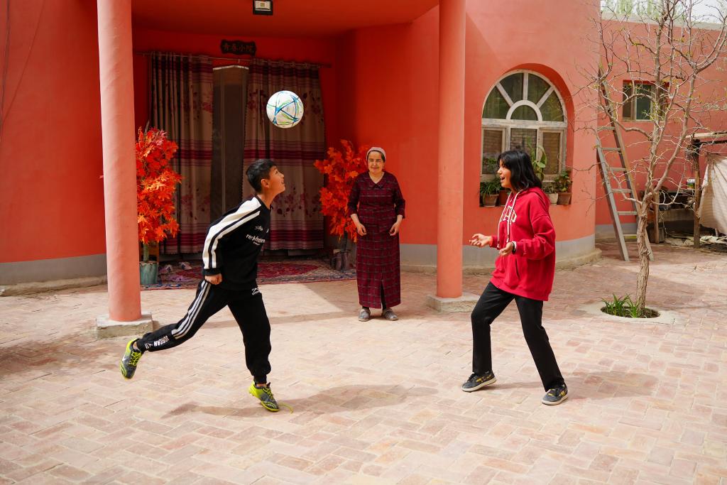 这是在新疆克孜勒苏柯尔克孜自治州阿图什市亚喀巴格村,阿图什市U13女子足球队球员艾妮再·阿布都如苏力(右)在家中的院子里和母亲、弟弟踢球(4月13日摄)。