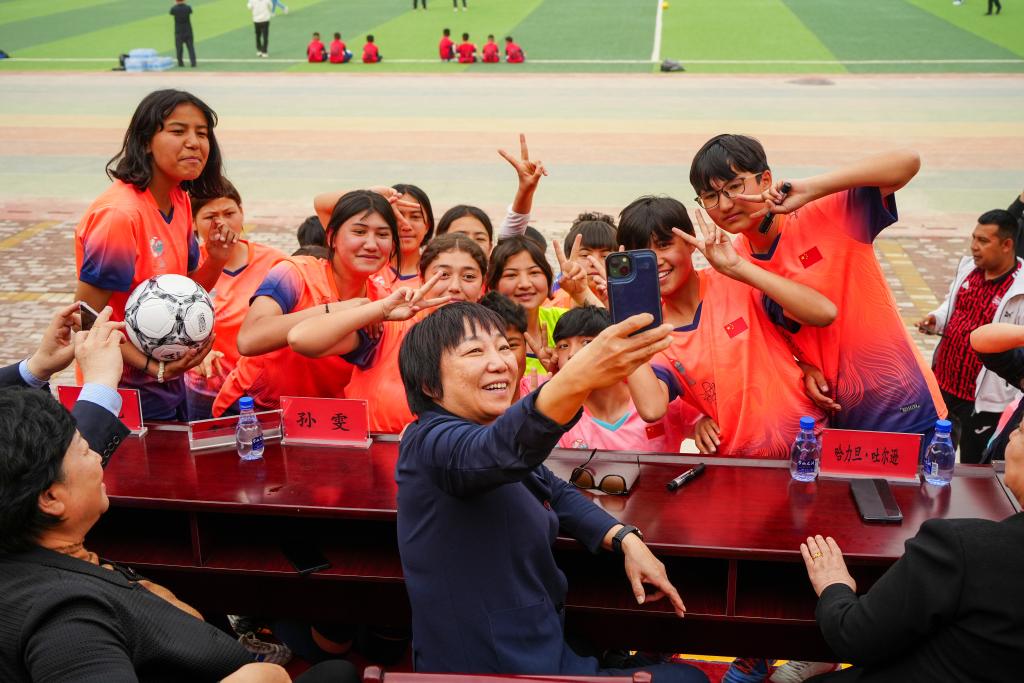 这是在2025新疆克孜勒苏柯尔克孜自治州足球联赛开幕式上,中国足协副主席、前中国国家女子足球队球员孙雯(前中)与阿图什市U13女子足球队合影(4月12日摄)。