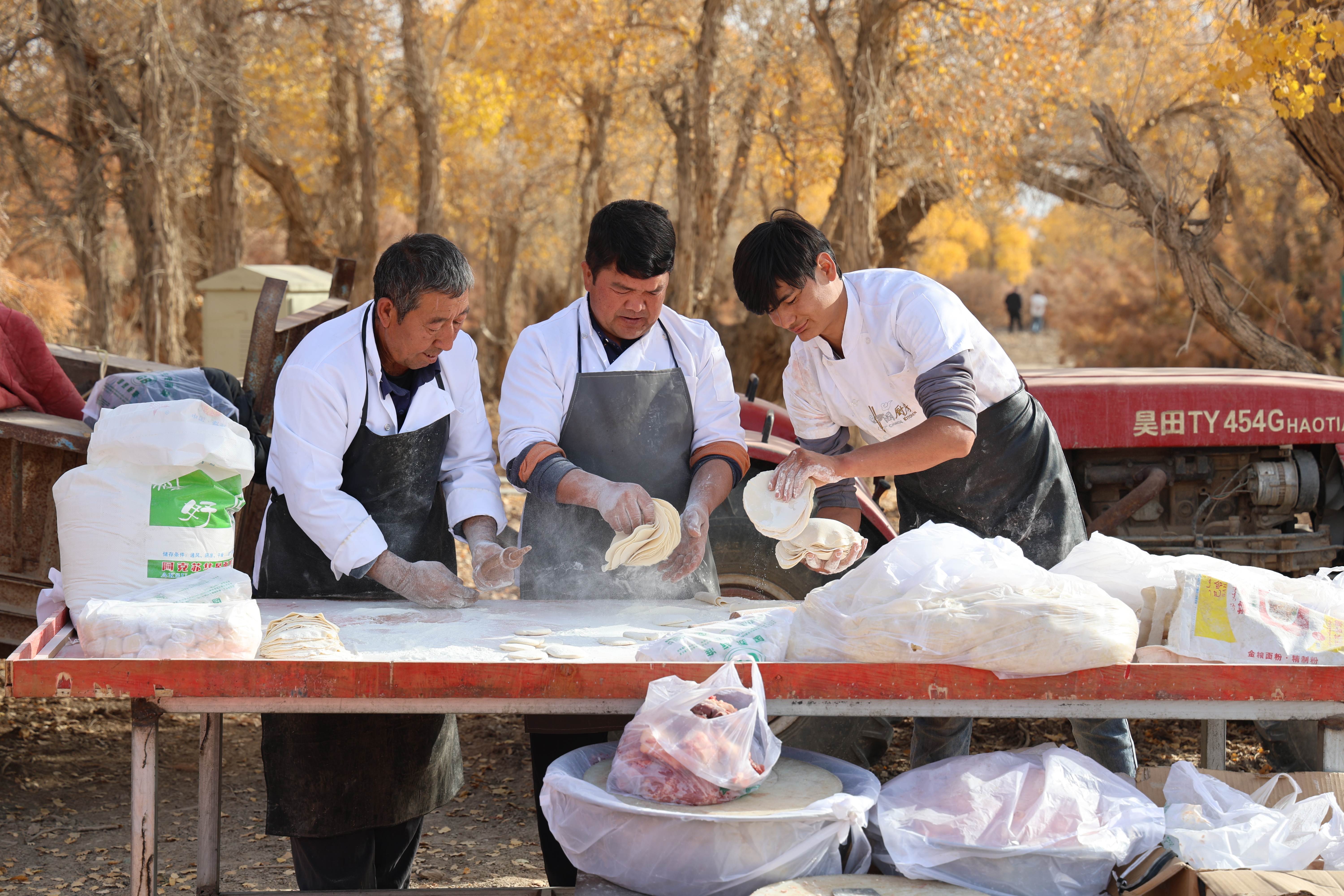 回到温宿老城,正午的巴扎(集市),刚出炉的馕饼冒着阵阵的热气;炭坑里的烤包子吱吱作响;铜匠铺里,铁锤叮咚砸出莲花纹铜壶;艾德莱丝绸铺前的老板娘指尖一捻,斑斓的丝绸便抖落一片虹光。“玛仁糖——玛仁糖——”龟兹古调的叫卖声钻进耳蜗。卖糖的艾力大叔掀开油纸,核桃与蜂蜜做成的切糕泛着琥珀色,咬下一口,甜腻、香浓裹着粗粝。老城的烟火足以让你在时光的隧道里穿越千年。