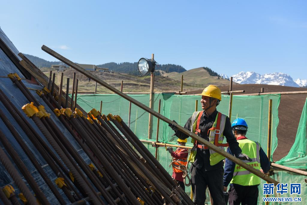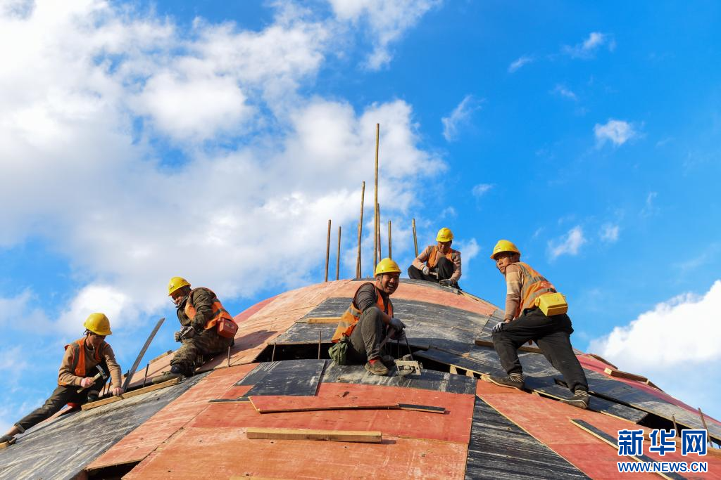 4月30日,工人在奇台射电望远镜中心塔施工现场作业。新华社记者 高晗 摄
