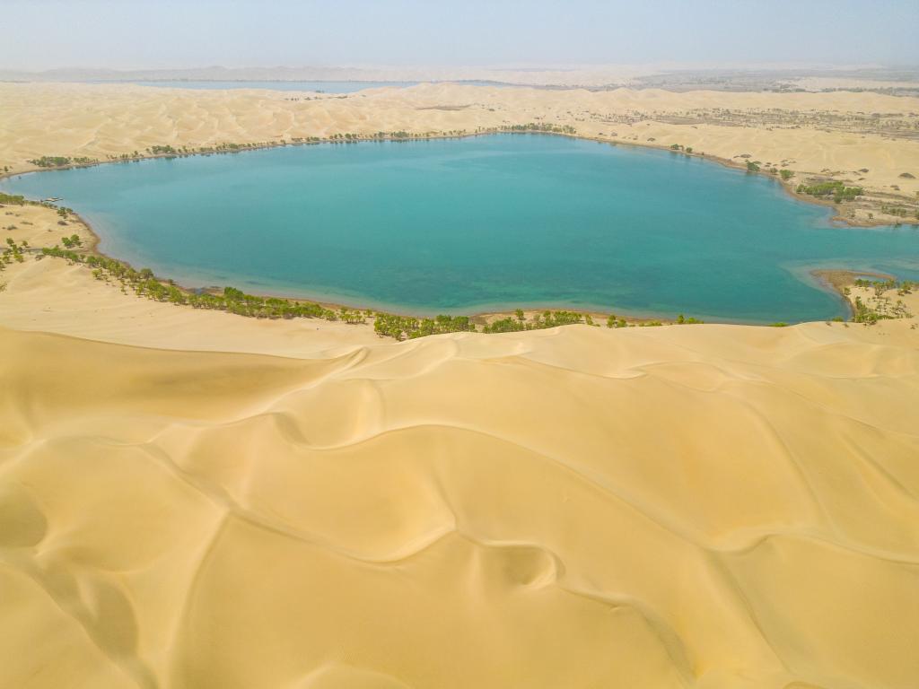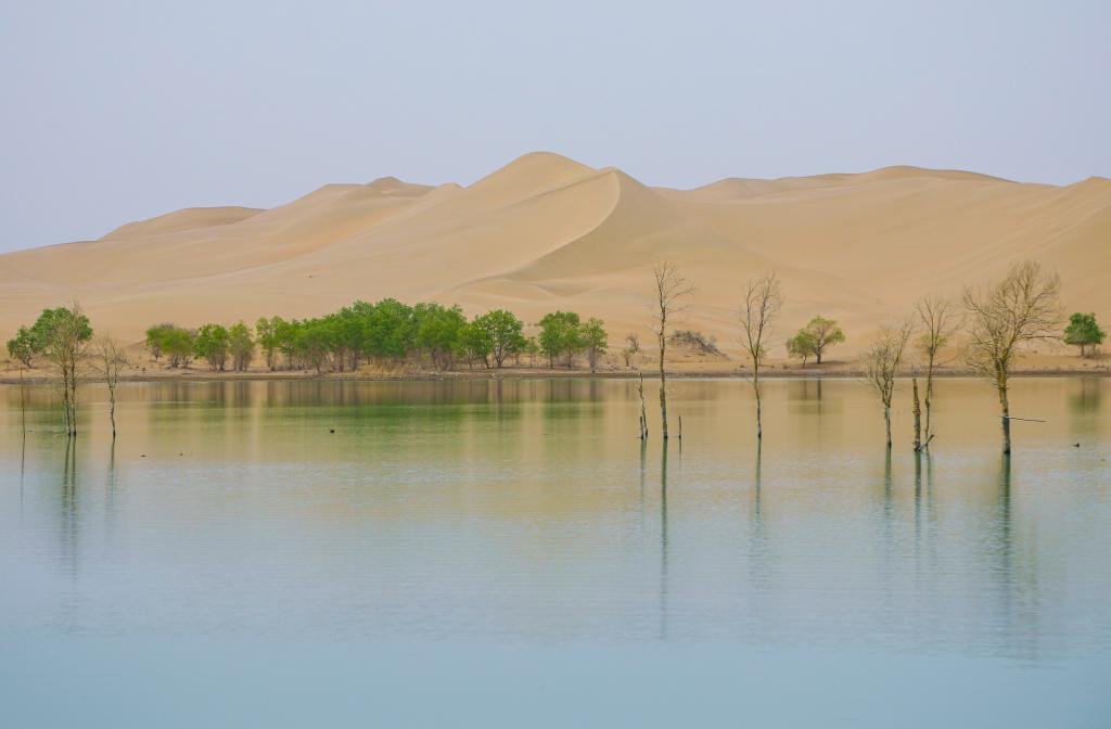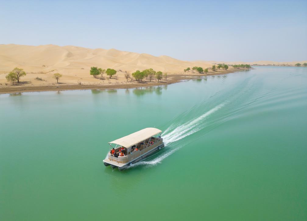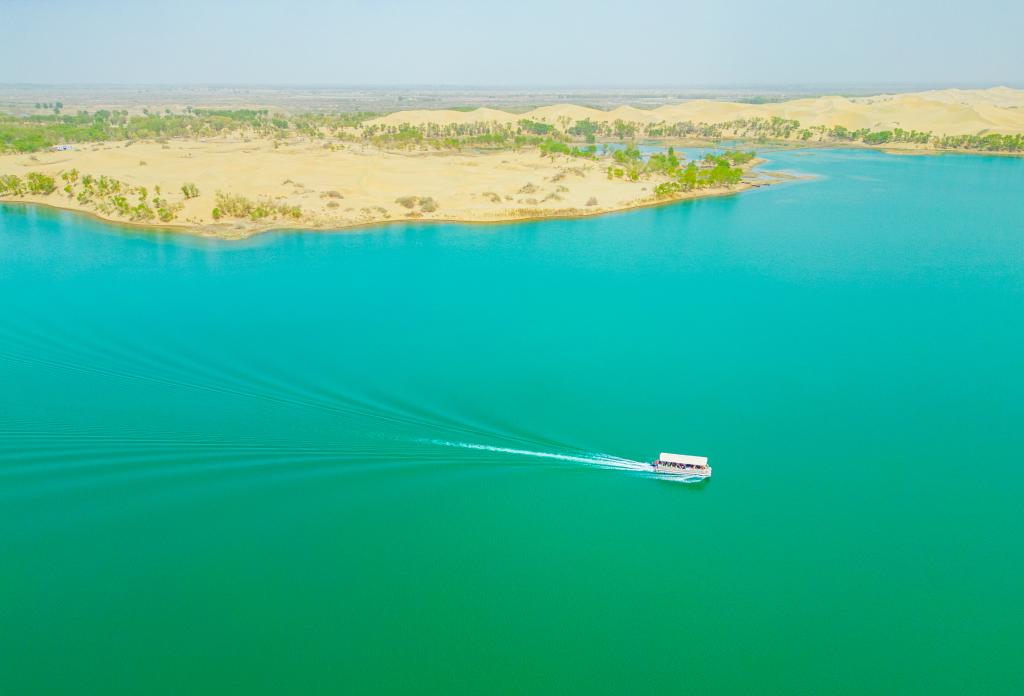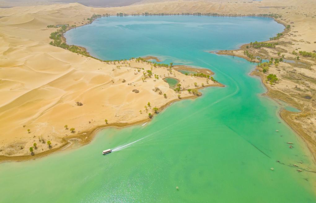 近日,新疆巴音郭楞蒙古自治州尉犁县罗布湖“沙湖交织”,美景如画,吸引游客纷至沓来。
