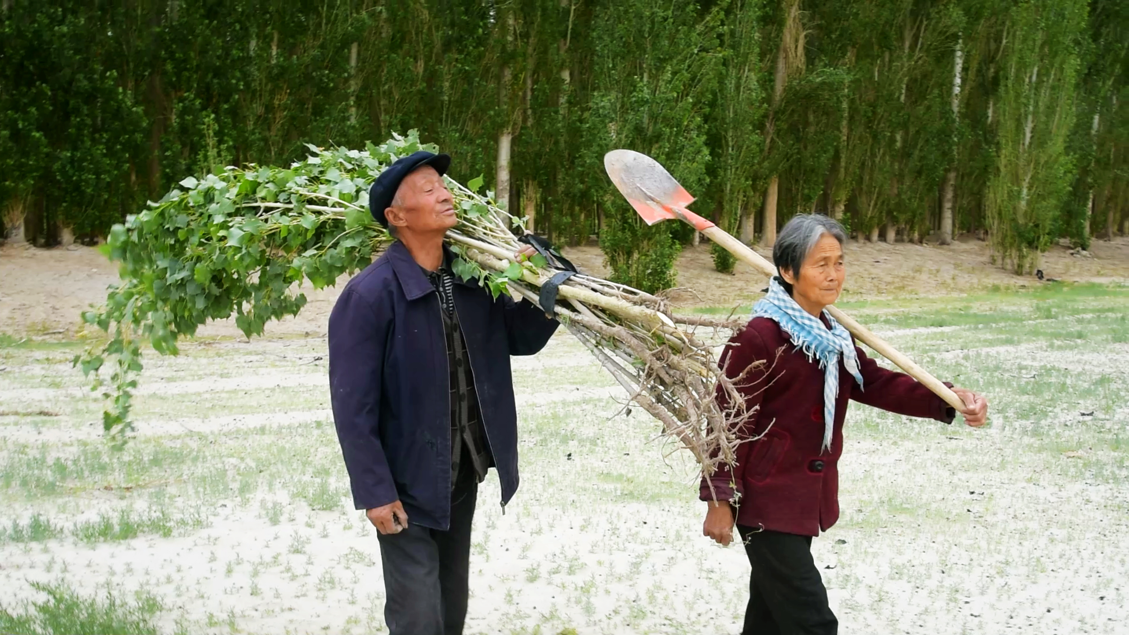 然而,在沙漠种树绝非易事。付志周夫妇从自家麦田边的沙包开始下手,拉沙、平地、挖坑,经济困难,只能捡别人果园里剪下来的树枝插栽。二人天不亮就开始干活,中午就在地里吃干馕,天黑透了才往回走。