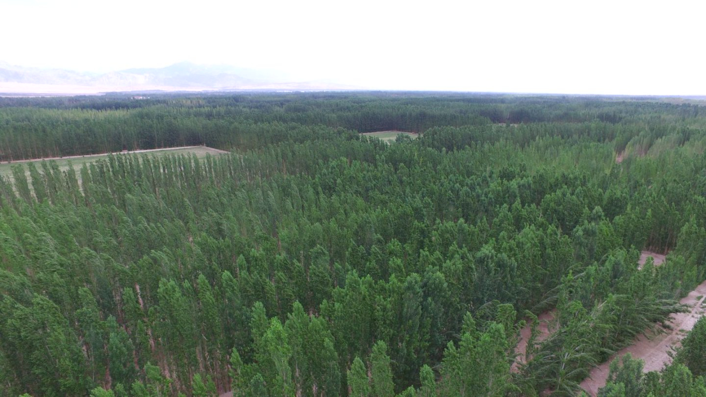 付志周在沙漠边缘种下的大片防护林,绿意盎然。