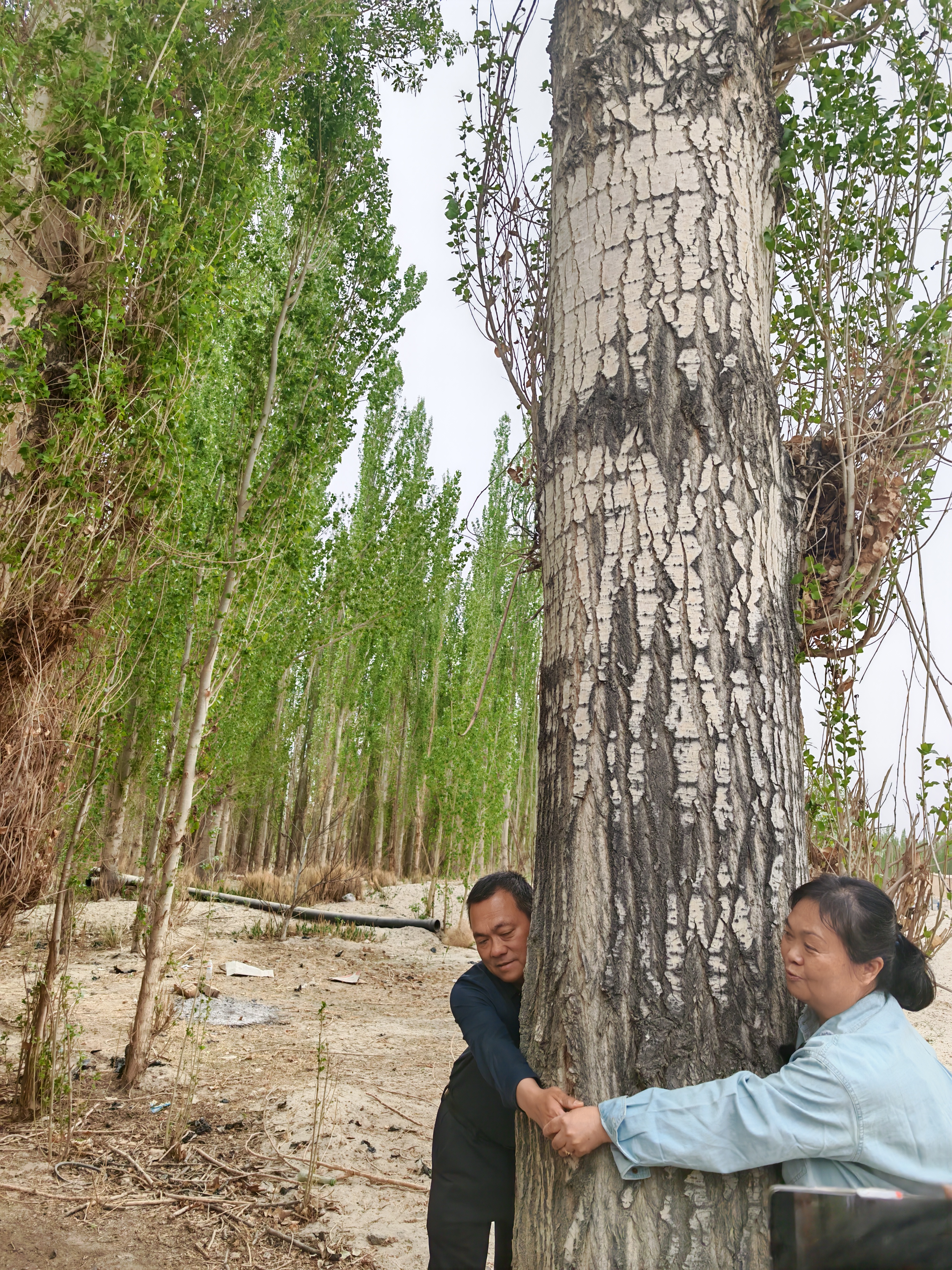 付志周的大女儿付喜梅和六弟付温平合力抱住父亲栽种的第一代白杨树。