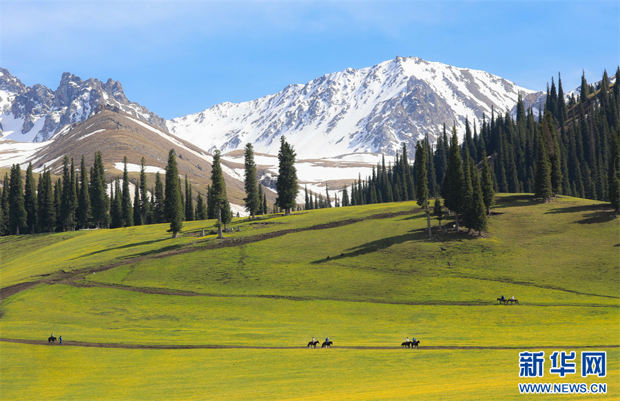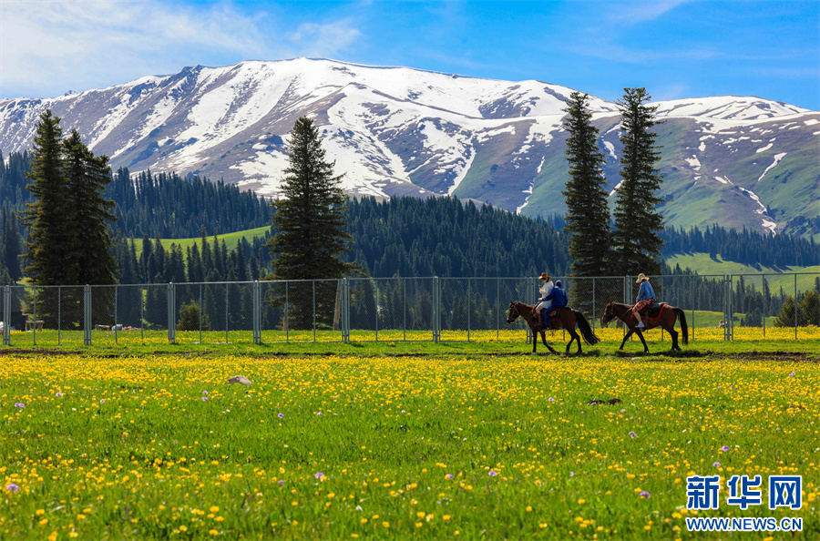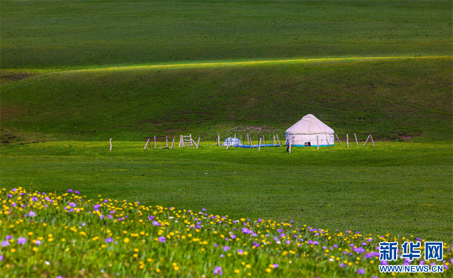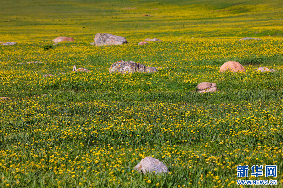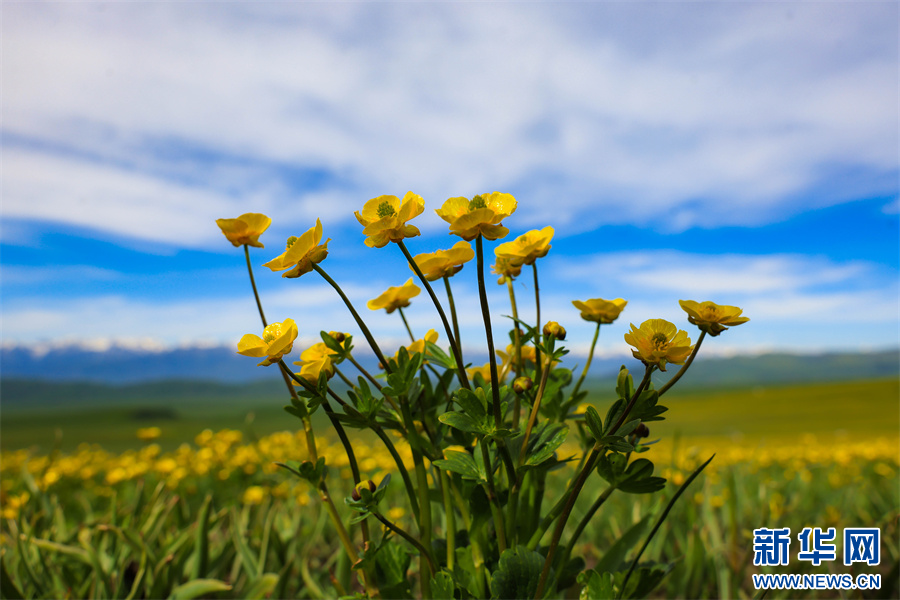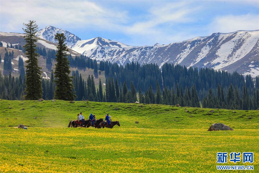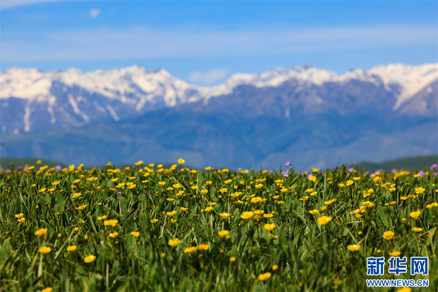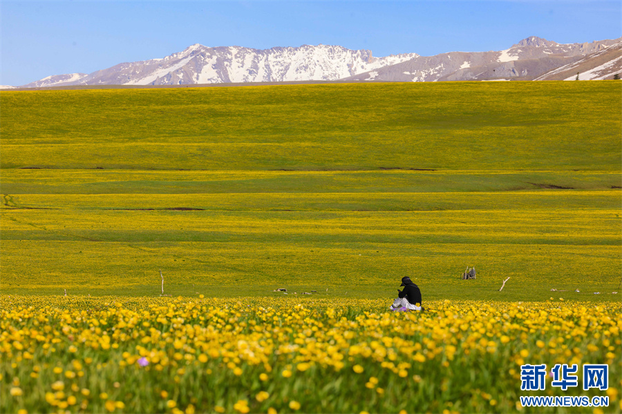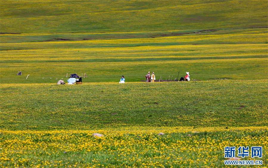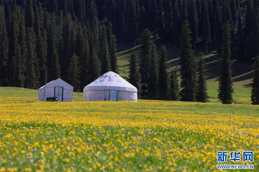 来到那拉提空中草原游牧人家节点,远远望去,金黄色的花朵铺满起伏的草原,与翠绿的草甸,巍峨的雪山,湛蓝的天空,相互映衬,构成了一幅幅色彩斑斓的绝美画卷,让整个“空中草原”华丽变身为“空中花园”。微风拂过,花海泛起层层金色波浪,花香四溢,令人陶醉不已。