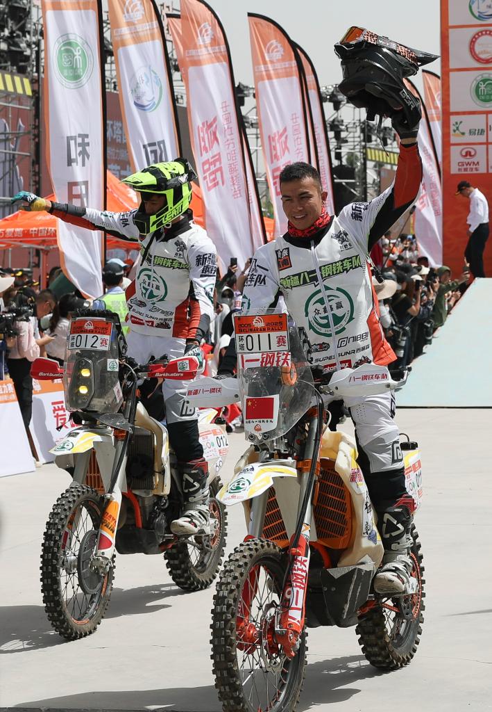 5月20日,新疆八一钢铁车队车手阿巴斯·加帕尔(右)和艾孜海尔·加帕尔在发车仪式上。