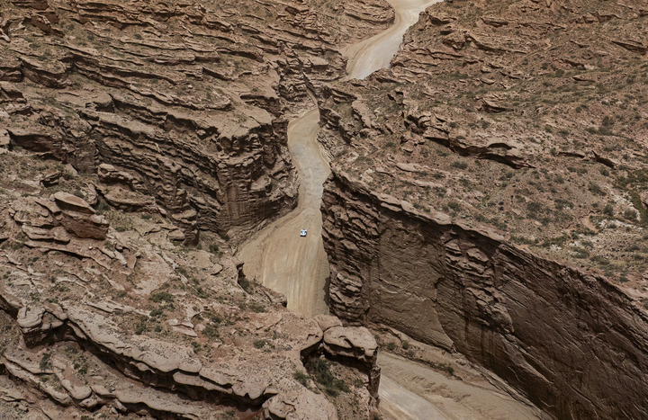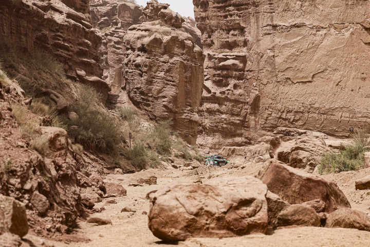 今年环塔的赛程设计有所“反转”,开局的SS1是去年临近尾声的赛段。当日特殊赛段全长近160公里,车手们需要快速通过被水流冲毁的路段,而后穿越多个河道,最终在温宿大峡谷中高速行驶冲线。