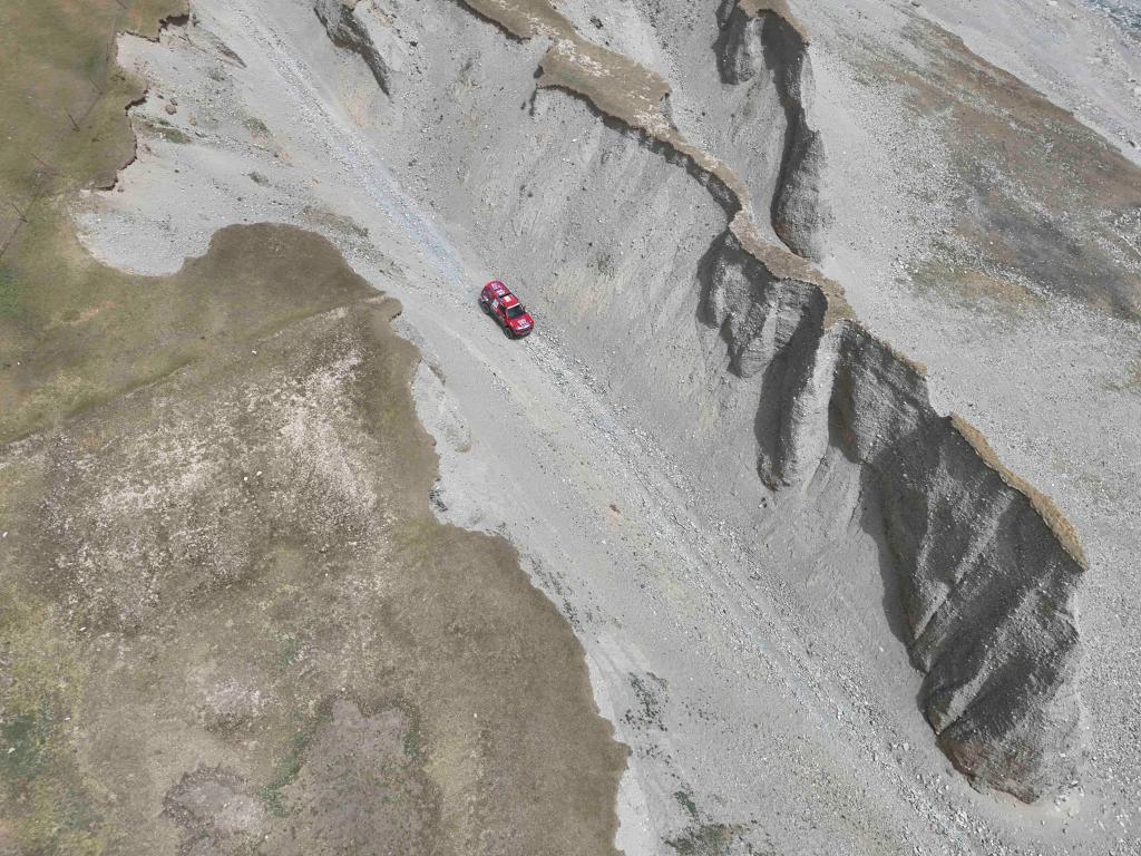 5月21日,纵横G700车队车手那音太、领航员敖布勒格驾驶赛车在第一赛段比赛中(无人机照片)。