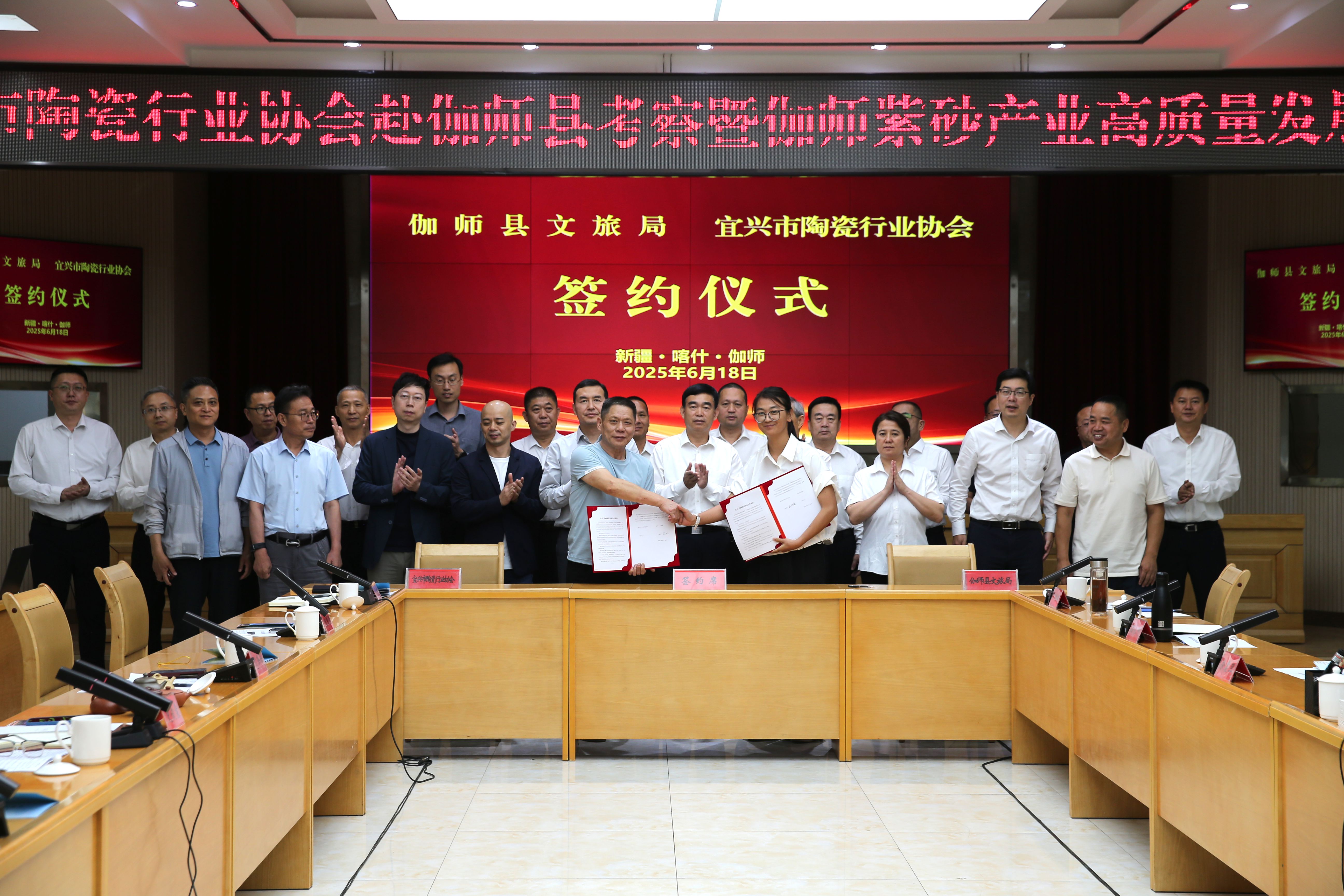 座谈会上,伽师县文旅局、宜兴市陶瓷行业协会签订了《宜兴、伽师陶瓷发展合作意向》,确定了双方长期交流合作机制,未来将围绕陶土的开发、陶瓷的生产、人才的培养、陶瓷文化展开交流合作。