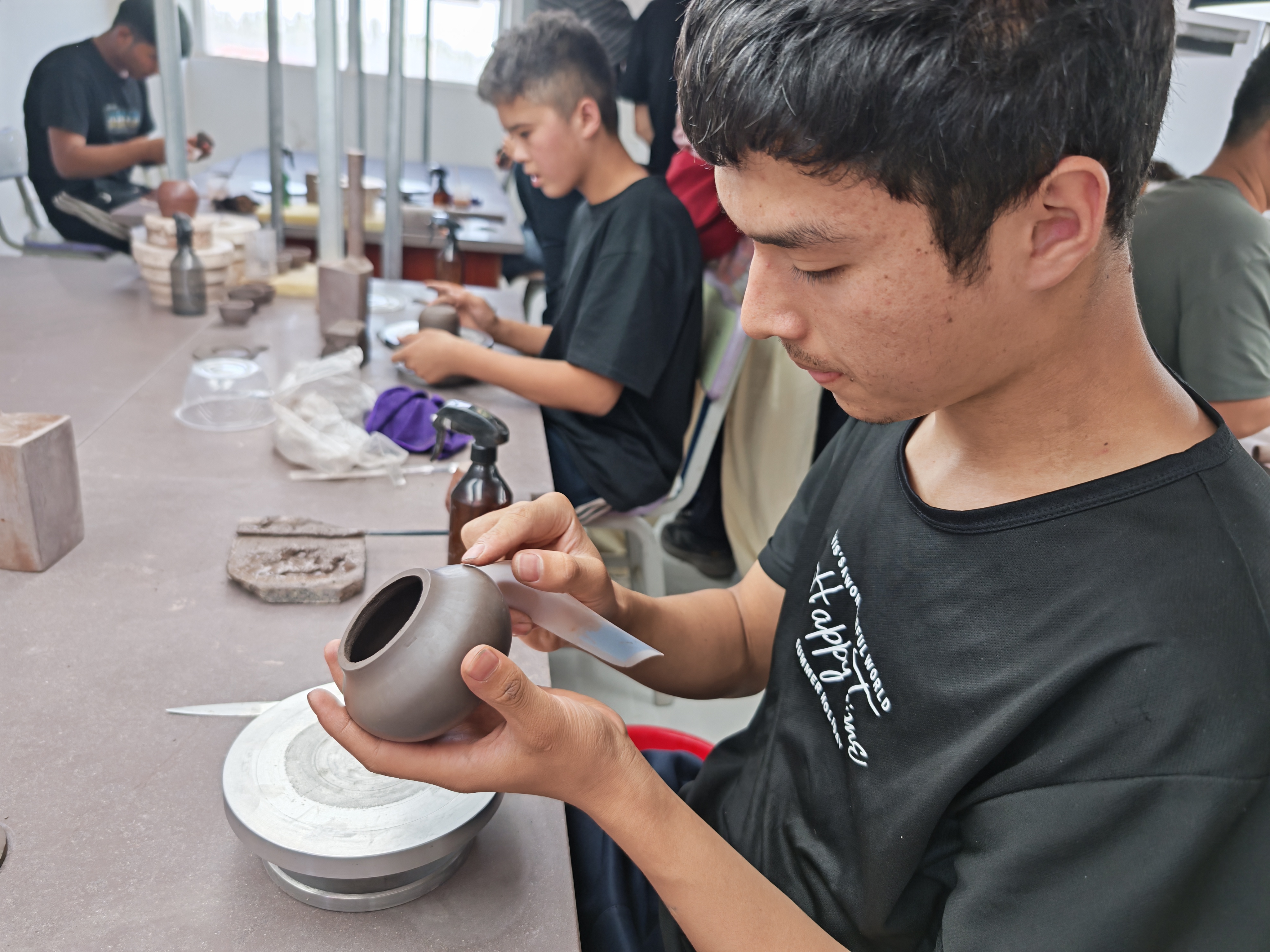 与此同时,伽师县技工学校开设陶瓷专项培训课,采取“校企合作”,创新构建“专家授课+师带徒”多轨培养机制,模式精准培育百余名本土技术骨干。此举不仅实现宜兴千年紫砂技艺在伽师落地生根,更确保了技艺传承的可持续性。在宜兴专家的指导下,伽师建立了标准化的紫砂泥料加工车间,引进先进的生产设备,并制定了严格的质量控制体系。