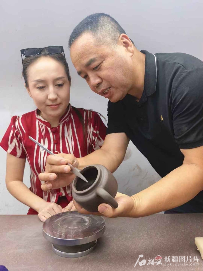 宜兴市陶瓷行业协会的大师在工作间给学生传授紫砂壶制作技艺。石榴云/新疆日报记者 何新社摄
