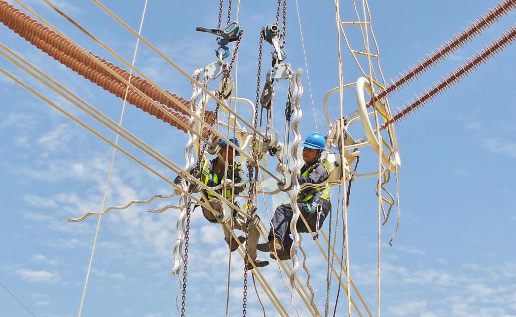 7月13日一早,33岁的架线工陈林攀上70米高的铁塔,像一位悬空的“舞者”在导线上完成最后的附件安装。