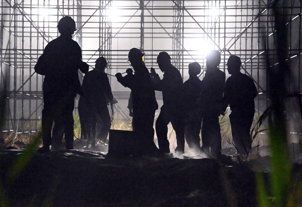7月10日,陈林(左四)和工友在工程现场休息时聊天。