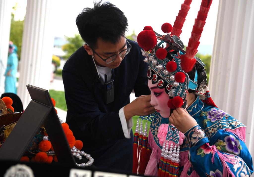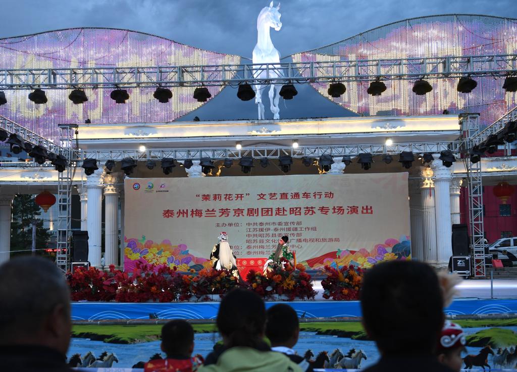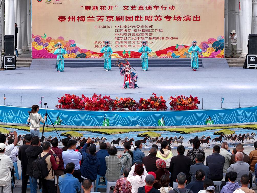 当日,在新疆昭苏县乌孙广场,江苏泰州梅兰芳京剧团"茉莉花开"文艺直通车为当地群众带来经典折子戏专场演出,上演《扈家庄》《将相和》等京剧名段。此次演出是泰州市推进文化润疆的具体实践,通过"送戏进疆"促进两地文化交流,展现了"泰昭一家亲,共谱同心曲"的深厚情谊。
