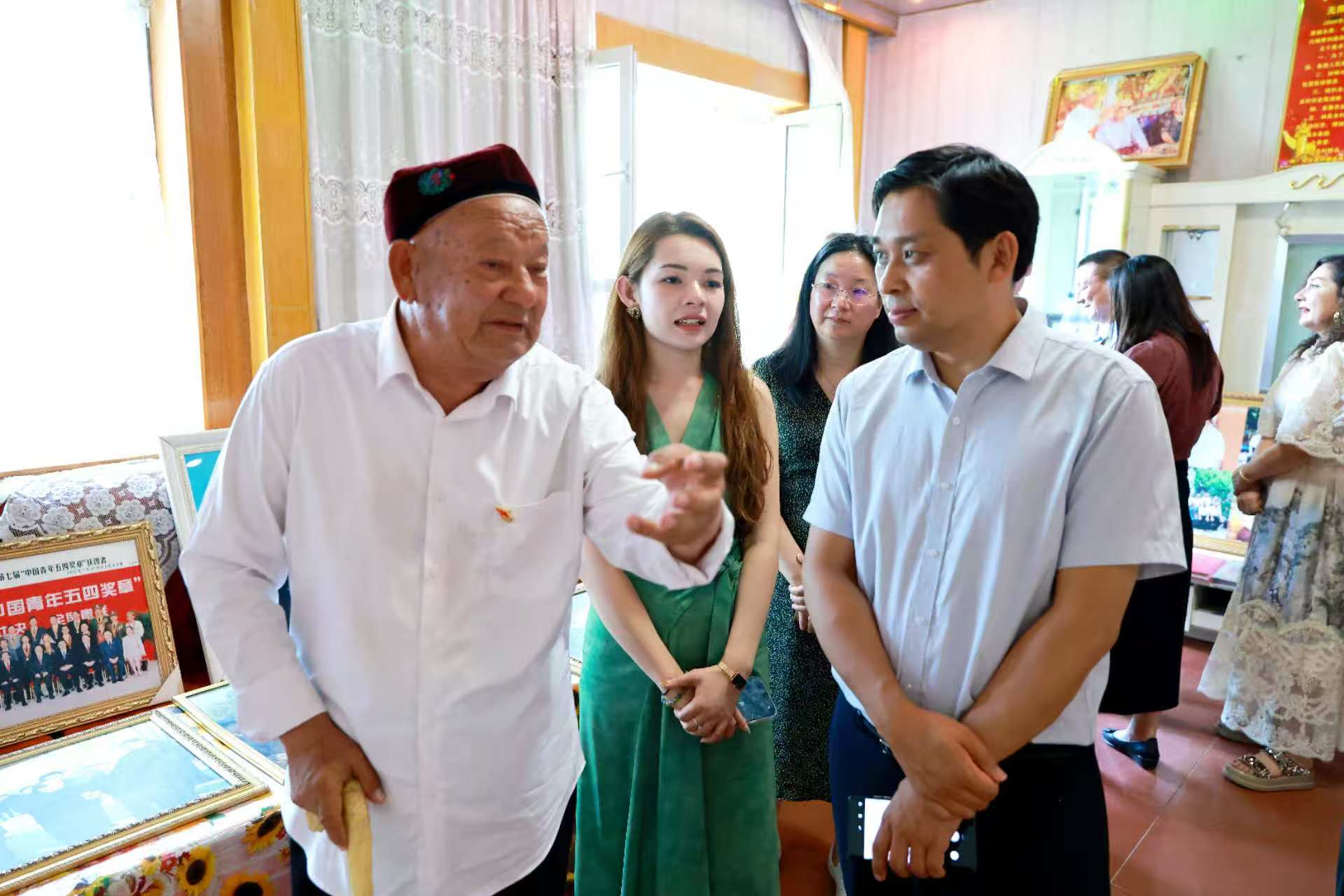当天,云南民族大学“同心共绘石榴红”——2025年度暑期铸牢中华民族共同体意识师生实践团还拜访了达西村发展的领路人——全国优秀党务工作者、自治区劳动模范、兴平镇达西村原党委书记沙吾尔·芒力克。沙吾尔深情回顾了带领村民将“盐碱滩”变为“南疆第一村”的奋斗历程,阐释了“口袋里要鼓囊囊,精神上要亮堂堂”的村训真谛。学生们纷纷表示,将以老书记为榜样,当好新时代民族团结的践行者、促进者、守护者,为铸牢中华民族共同体意识贡献青春力量。