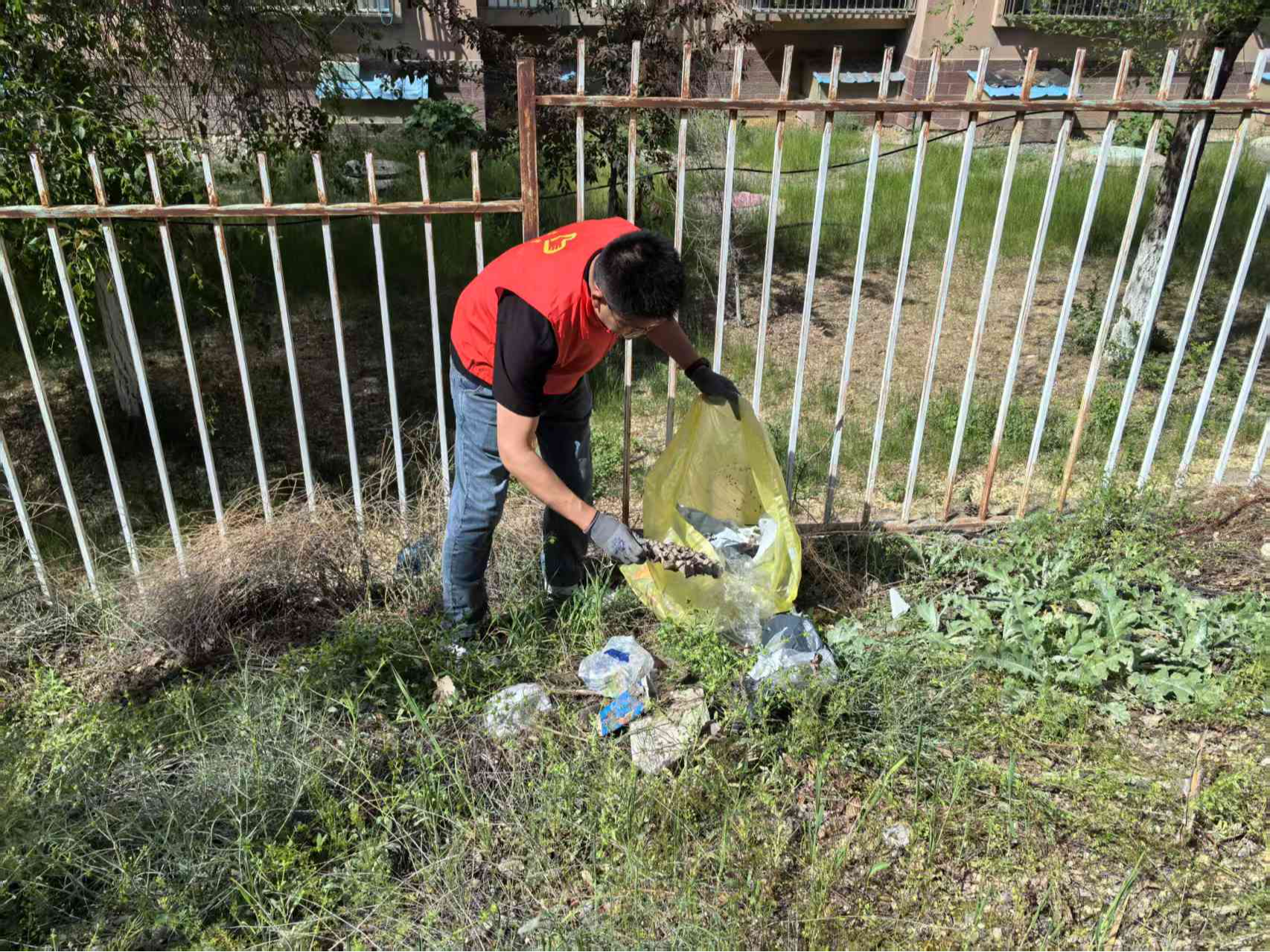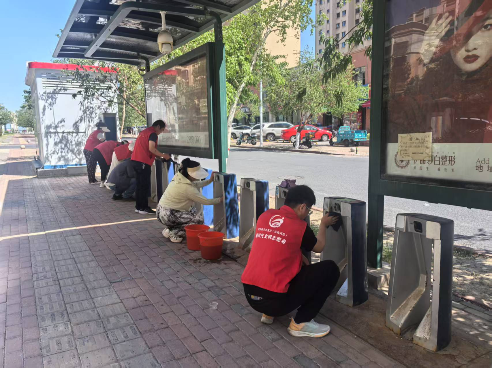 学习结束后,党员与志愿者迅速投入环境整治行动,兵分多路开展工作。一路前往公交站点,手持抹布、水桶,仔细擦拭公交护栏、宣传展板等设施,去除灰尘、污渍,让公交设施焕新颜;另一路深入绿化带,大家戴着手套,弯腰捡拾隐藏其中的塑料袋、纸屑、烟头等垃圾。同时,还有人员对活动室进行全面清洁,有的仔细清扫地面灰尘和杂物,有的认真擦拭桌椅、书架和宣传展板,有的整理图书角的书籍报刊,确保各类物品摆放整齐有序。尽管天气炎热,但大家干劲十足,以细致行动改善环境。经过近两小时的共同努力,活动室面貌焕然一新,公交设施整洁清爽,绿化带恢复干净整洁,为居民营造了更美好的生活场景。