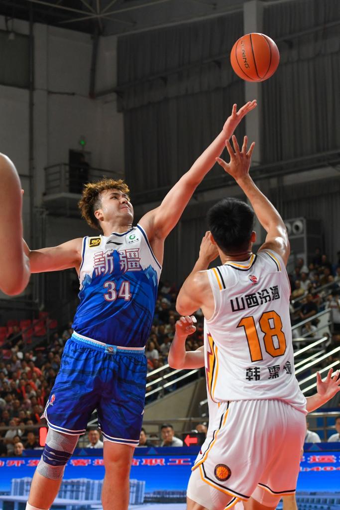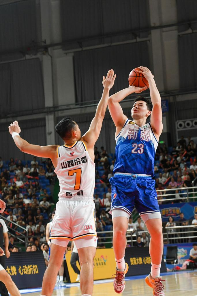 8月15日,山西汾酒队球员贾明儒(右一)在比赛中投篮。新华社记者 高晗 摄