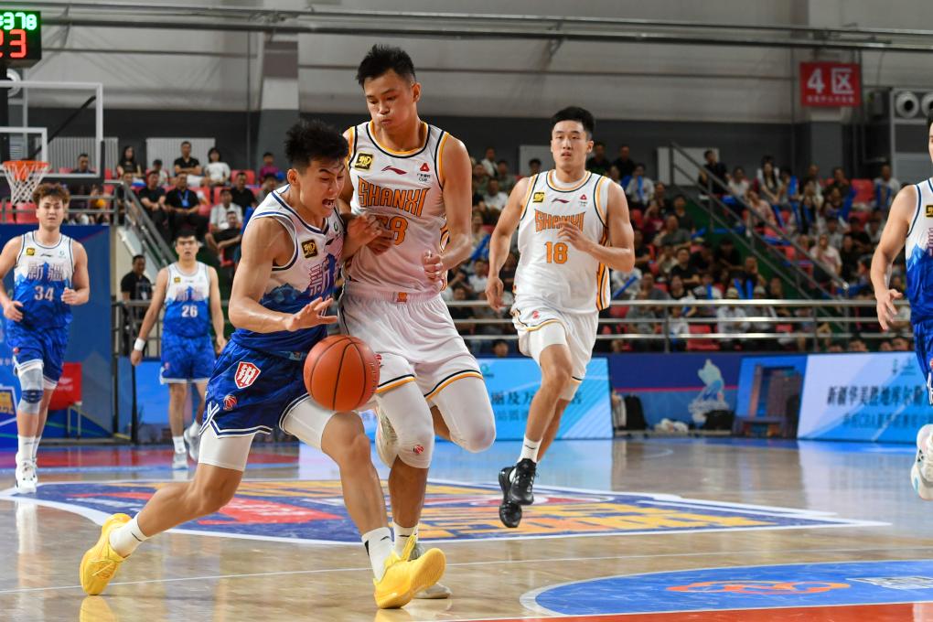 8月15日,山西汾酒队球员刘传兴(左)在比赛中持球进攻。新华社记者 高晗 摄