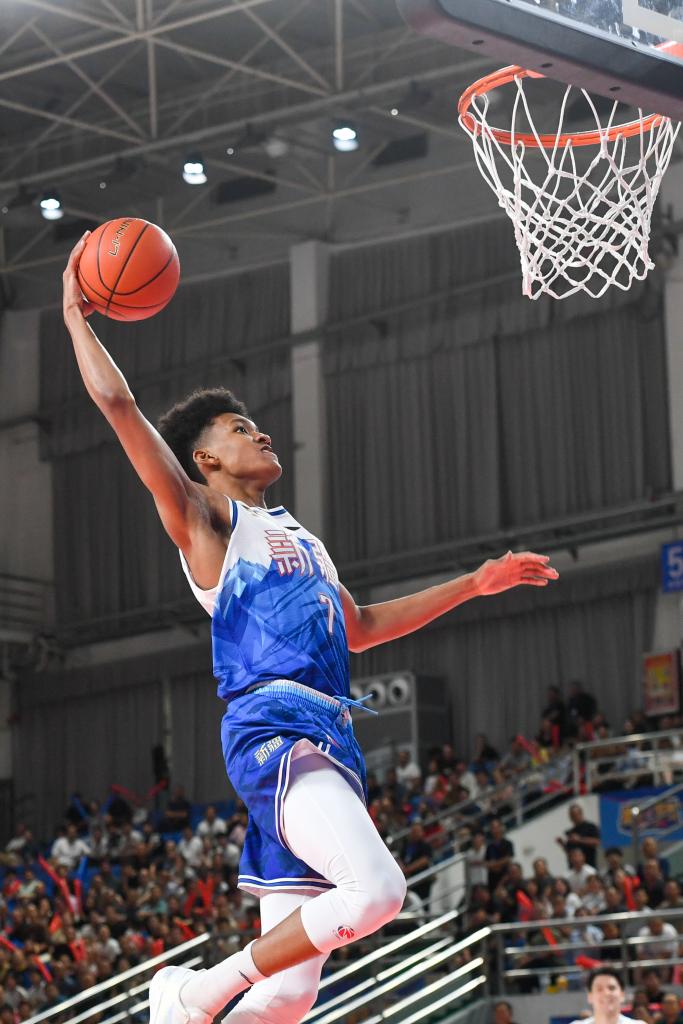 8月15日,新疆伊力特队球员冯傲在比赛中扣篮。新华社记者 高晗 摄