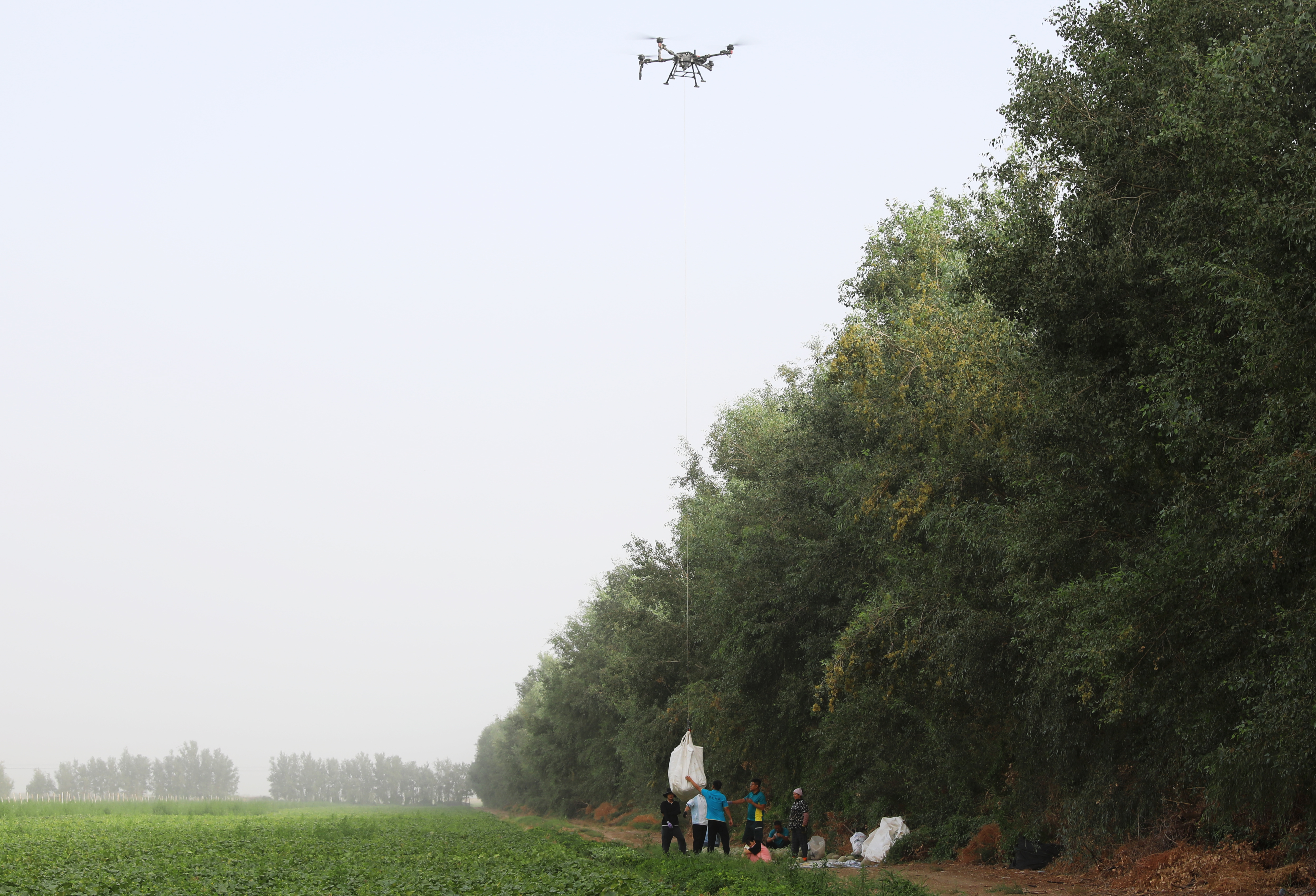 “飞手”娴熟操控无人机悬停在田间指定点位,瓜农立即将装有九成熟蜜瓜的编织袋挂上吊钩。仅用2分钟,无人机便将60公斤蜜瓜运至田埂边,接应瓜农将其轻卸于棉被上,全程耗时不足3分钟,又快又稳当。