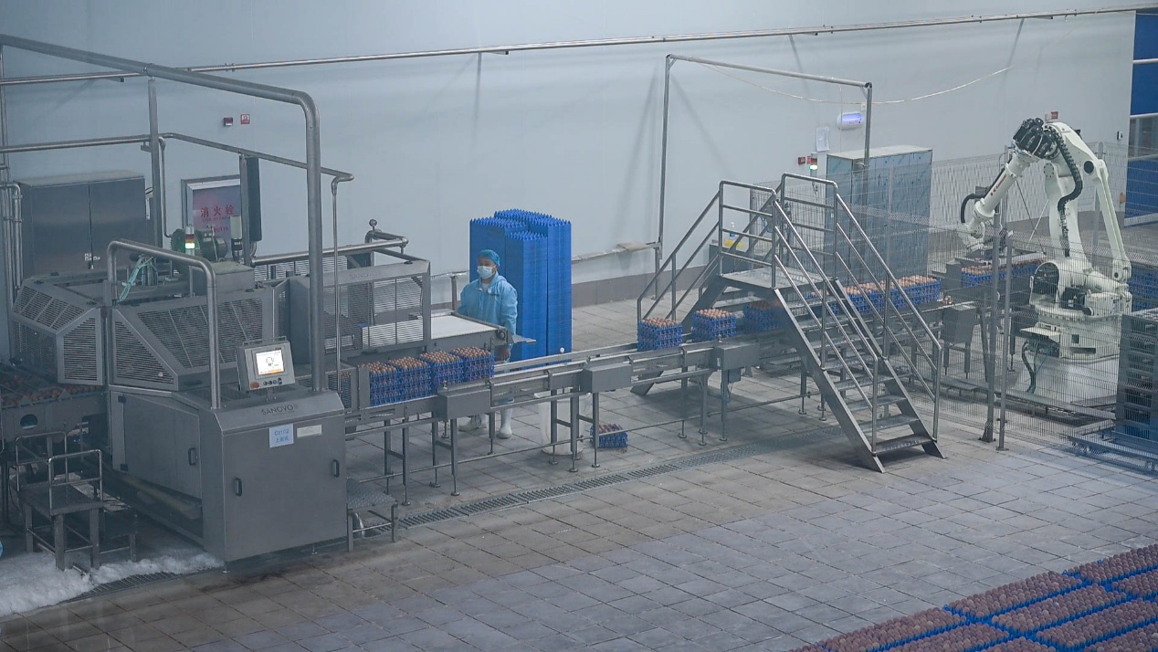 在新疆西帕健康食品有限公司的生产车间内,机械臂正将鸡蛋成批次地运送上传输带。